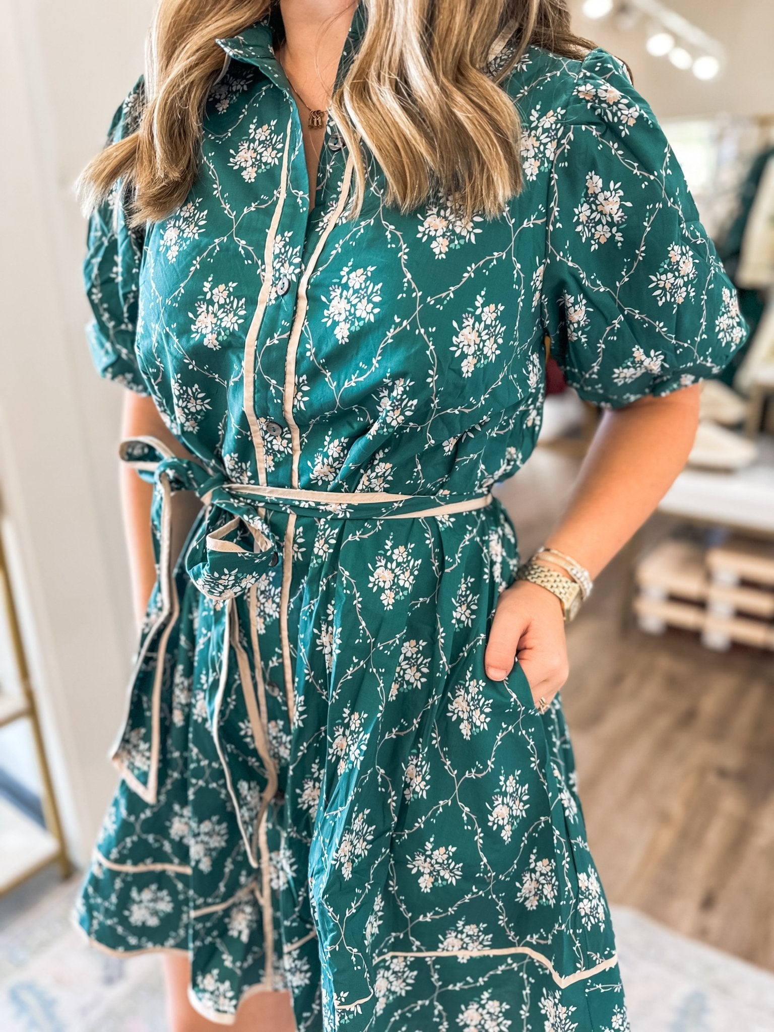 Perfect for fall outings and beyond, the Hunter Green Mulberry Manor Belted Mini Dress is an effortless blend of classic charm and modern ease. This collared, button-front dress features a rich hunter green mulberry hue with a delicate print, puff sleeves for a feminine touch, and a removable waist tie to create a flattering silhouette.