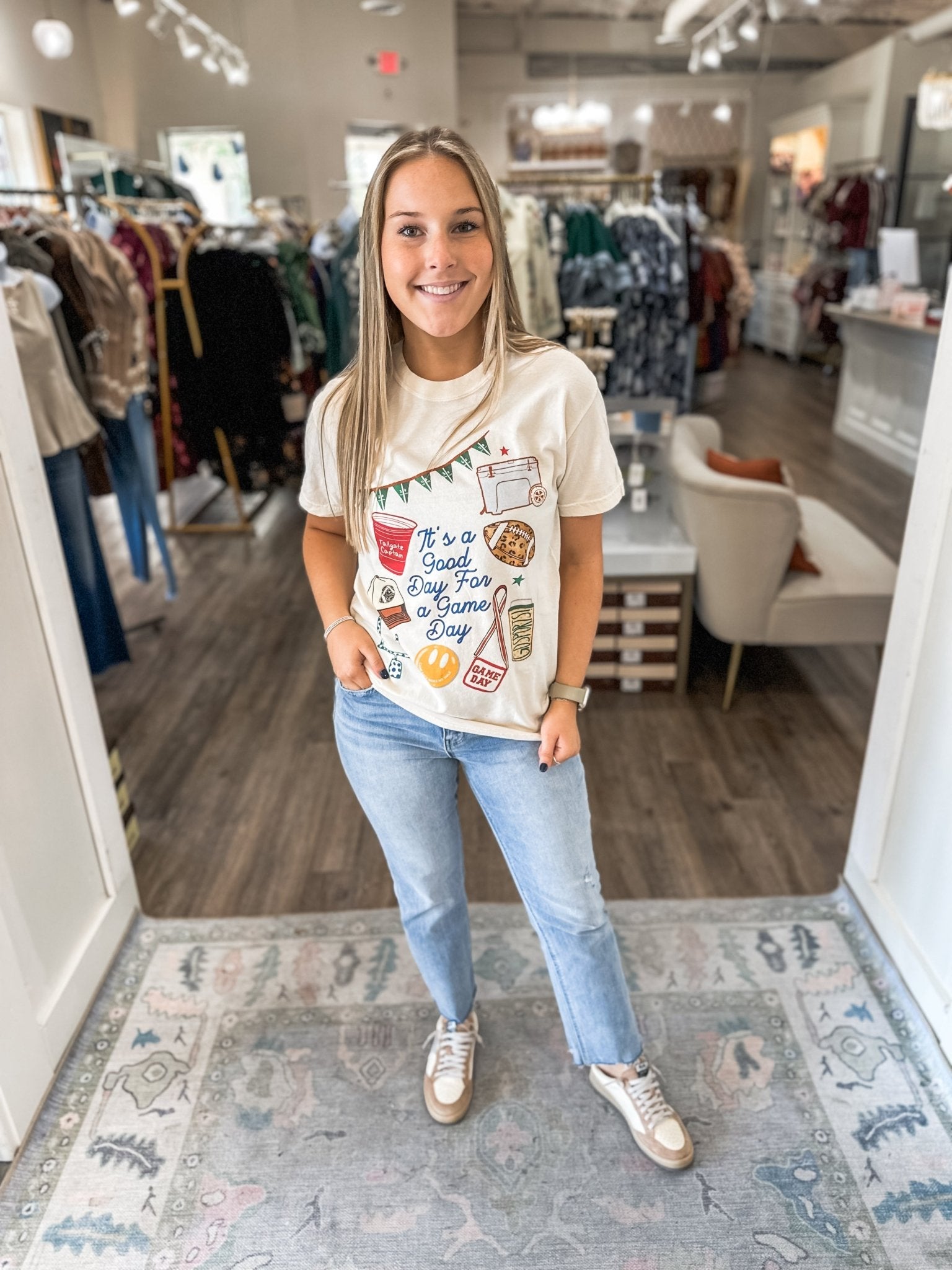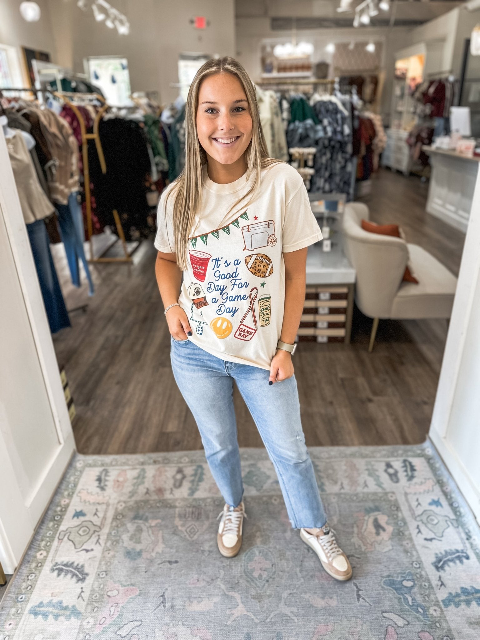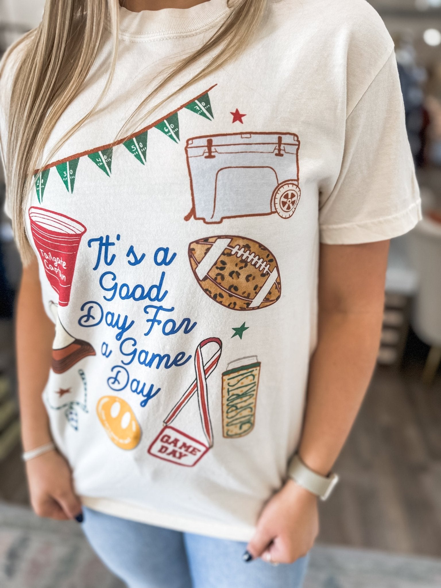Every Saturday’s a good one when you’ve got the perfect tee! 🏈✨ This “It’s a Good Day for a Gameday” graphic tee is the ultimate mix of comfort and spirit—ready for tailgates, touchdowns, and everything in between. The vintage-inspired design gives that effortlessly cute, casual vibe that’s perfect for pairing with denim, cutoffs, or your favorite lounge shorts.