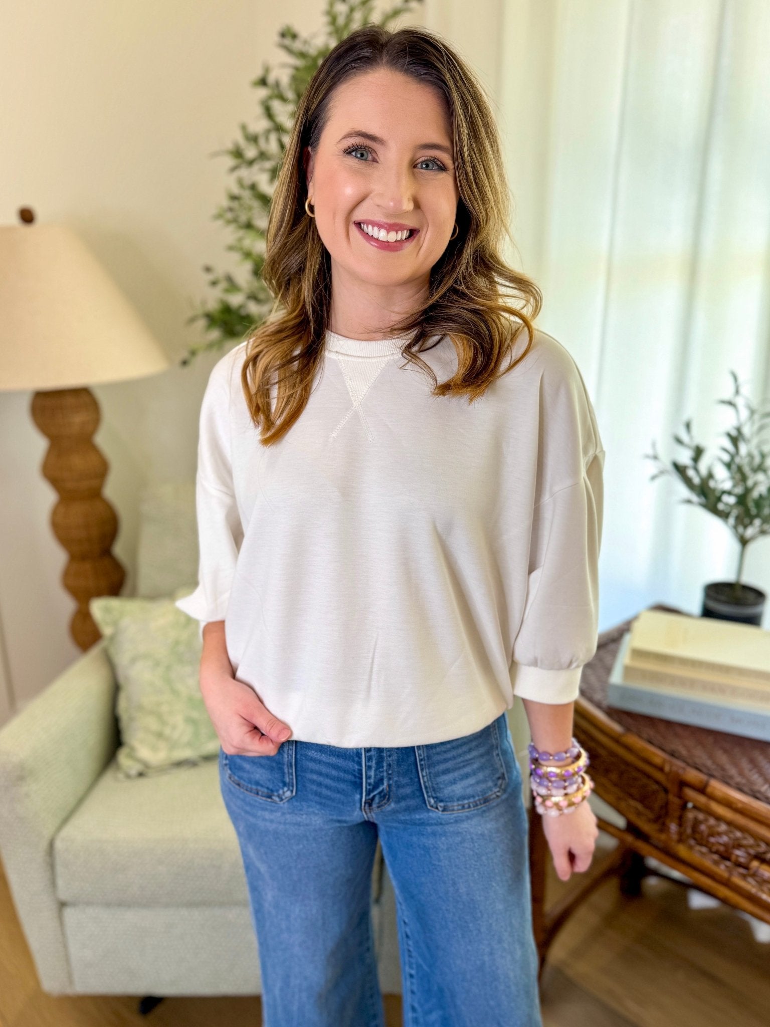 The Ivory Scuba Dolman Sleeve Pullover is the perfect mix of cozy and polished. With its relaxed fit and smooth, structured feel, this pullover is an easy everyday essential you’ll reach for again and again.