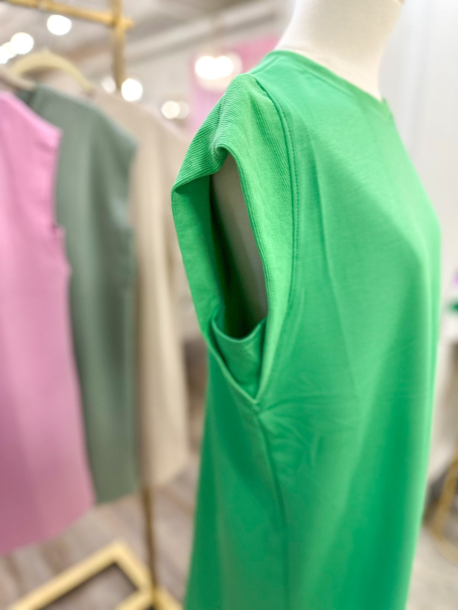 The Kelly Green Modern Essential Mini Dress is your go-to for easy, everyday styling. This sleeveless silhouette features a modern crew neckline and elevated shoulder seaming for a polished yet laid-back vibe. Whether you’re running errands or grabbing lunch, this dress is a spring essential you'll reach for again and again.