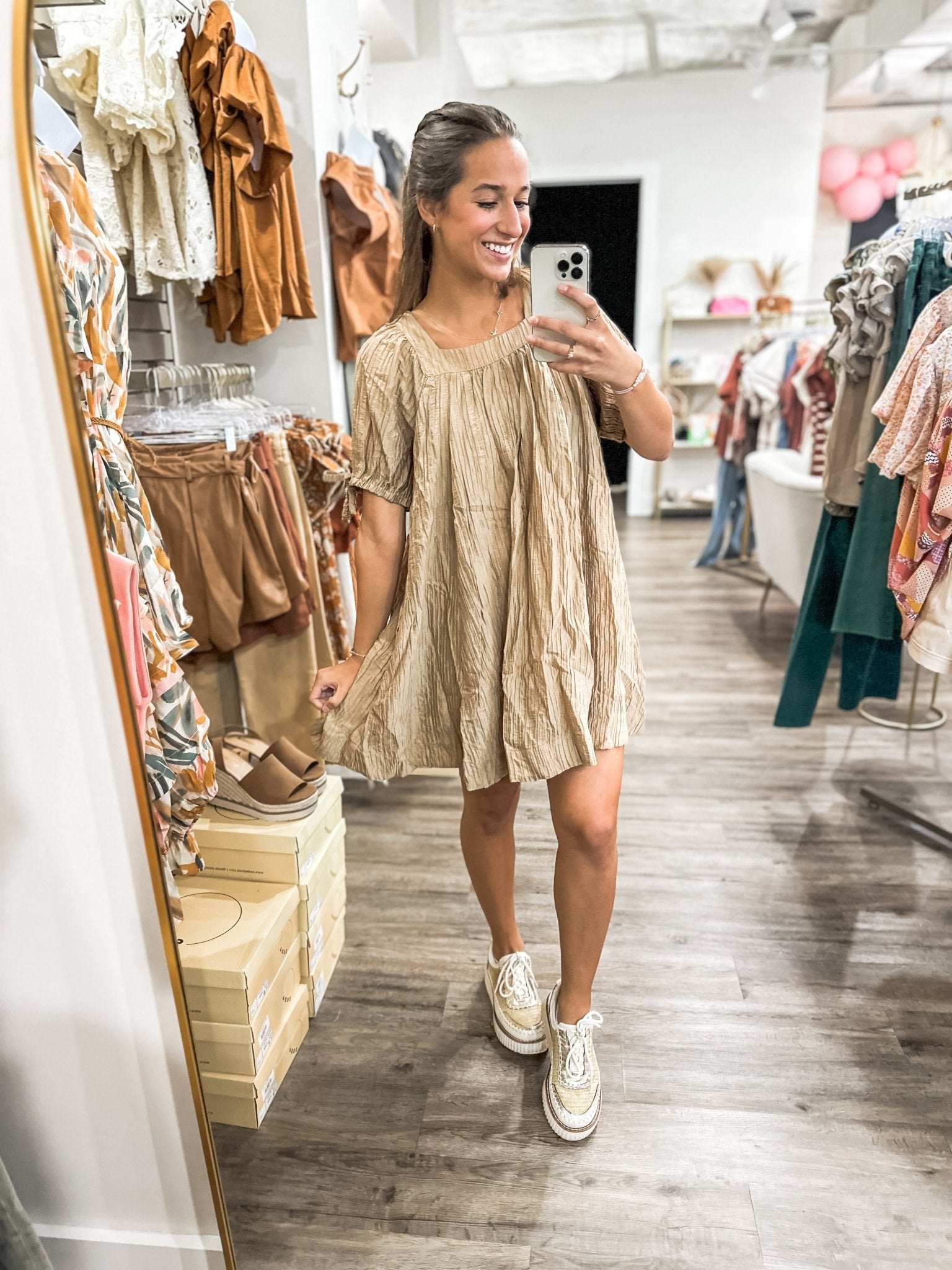 The effortless, throw-on-and-go dress you’ll reach for all season long. Crafted with a lightweight crinkle fabric, this dress features a relaxed swing silhouette, soft pleating along the neckline, and adorable adjustable tie sleeves. The square neckline keeps it modern and flattering, while the breezy shape makes it an easy yes for warm weather.