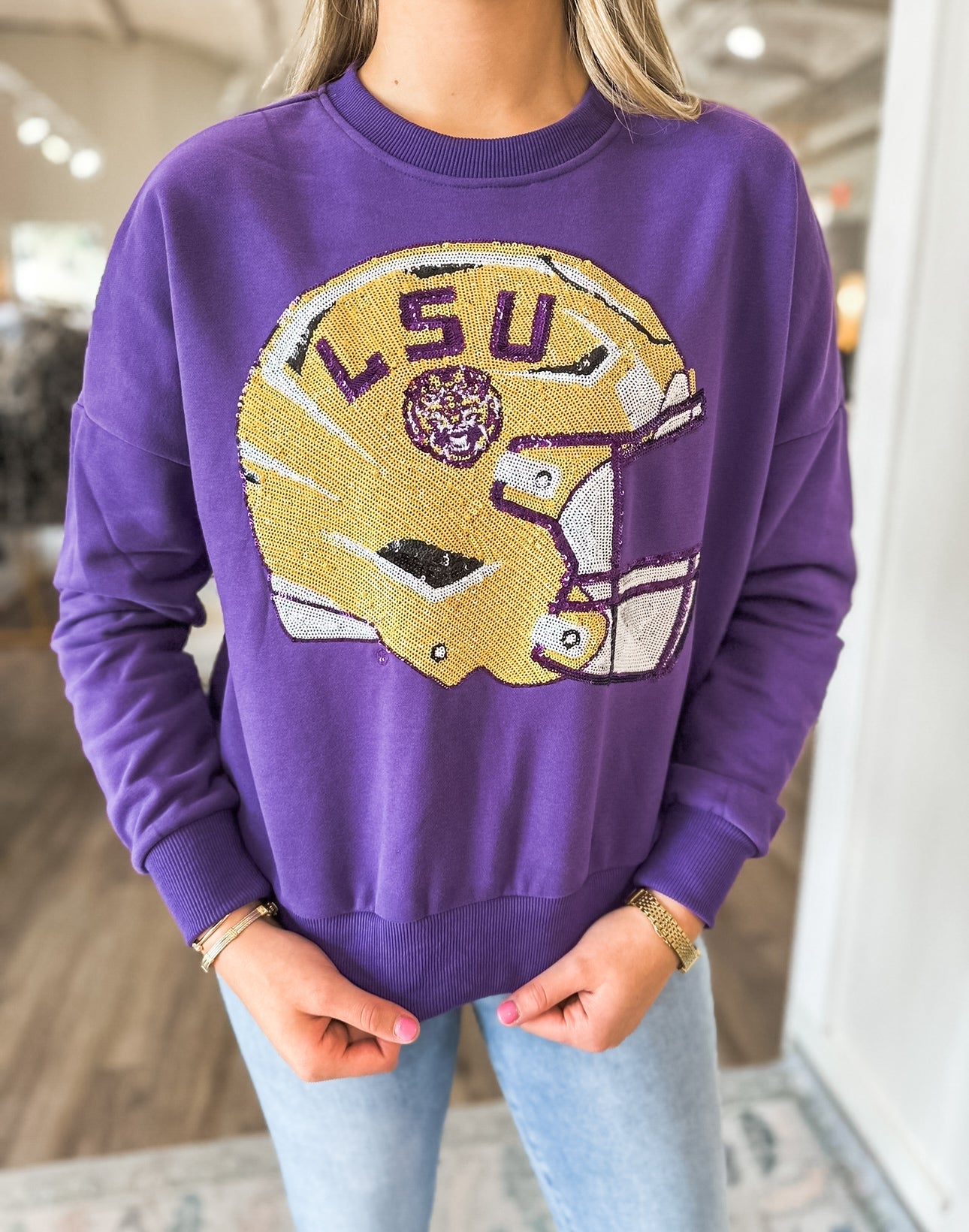 Shine bright on game day with this luxe LSU sweatshirt that’s anything but ordinary. The bold Tiger purple sets the stage, while the sequin helmet design brings all the sparkle to your gameday look. Perfect for tailgates, stadium stands, or watching from home in style.
