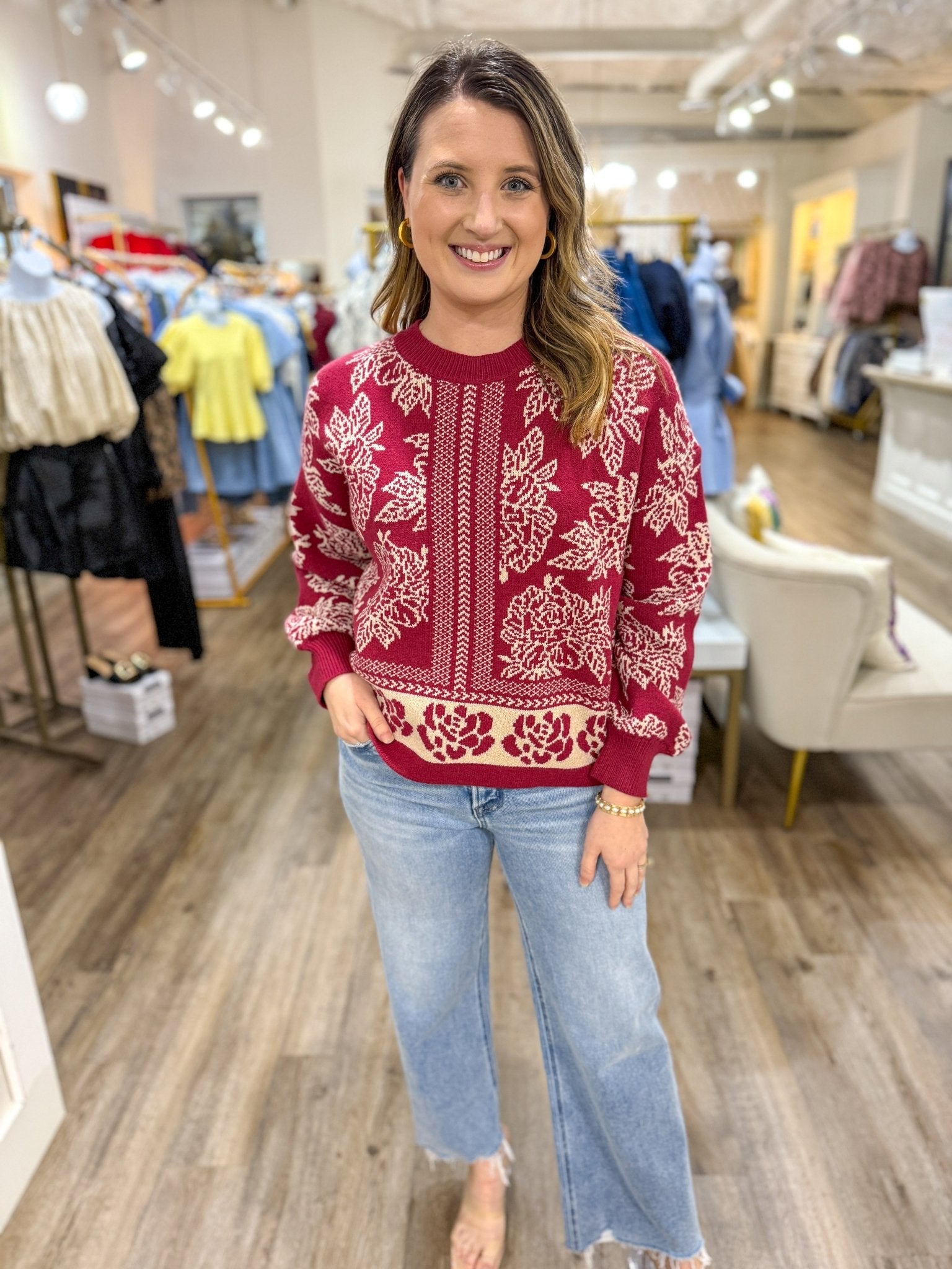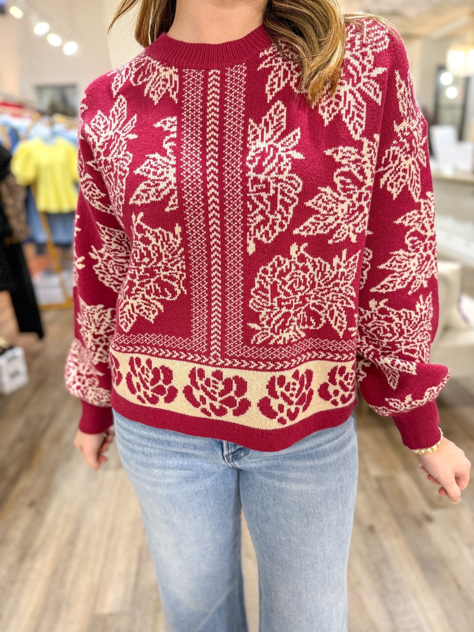 Romantic and timeless, the Marsala Vintage Garden Sweater features a gorgeous cream floral knit pattern set against a rich marsala red backdrop. The classic crew neckline and slightly relaxed fit make it a cozy yet elevated choice for cool days. Perfect with denim for casual charm or paired with a skirt for a more polished look.