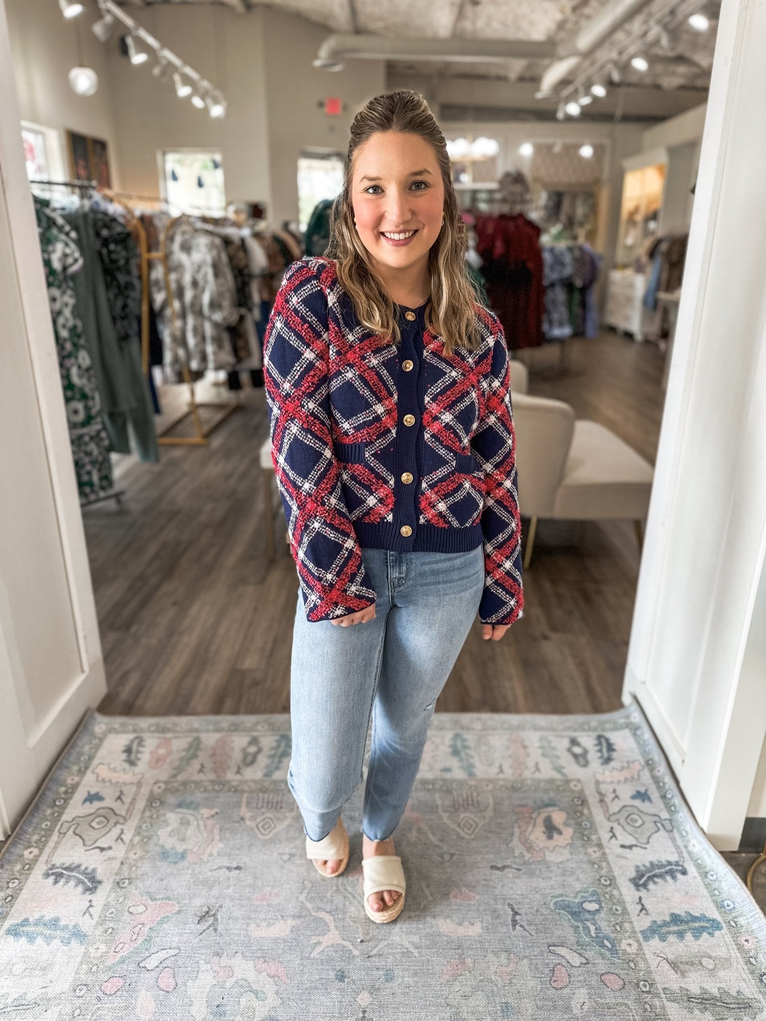 A cozy-chic layering piece for the season, the Navy Tartan Holiday Button Down Cardigan brings a playful yet polished touch to any outfit. Its classic tartan pattern feels festive and timeless, while the gold-tone buttons and ribbed trim add a luxe finish.