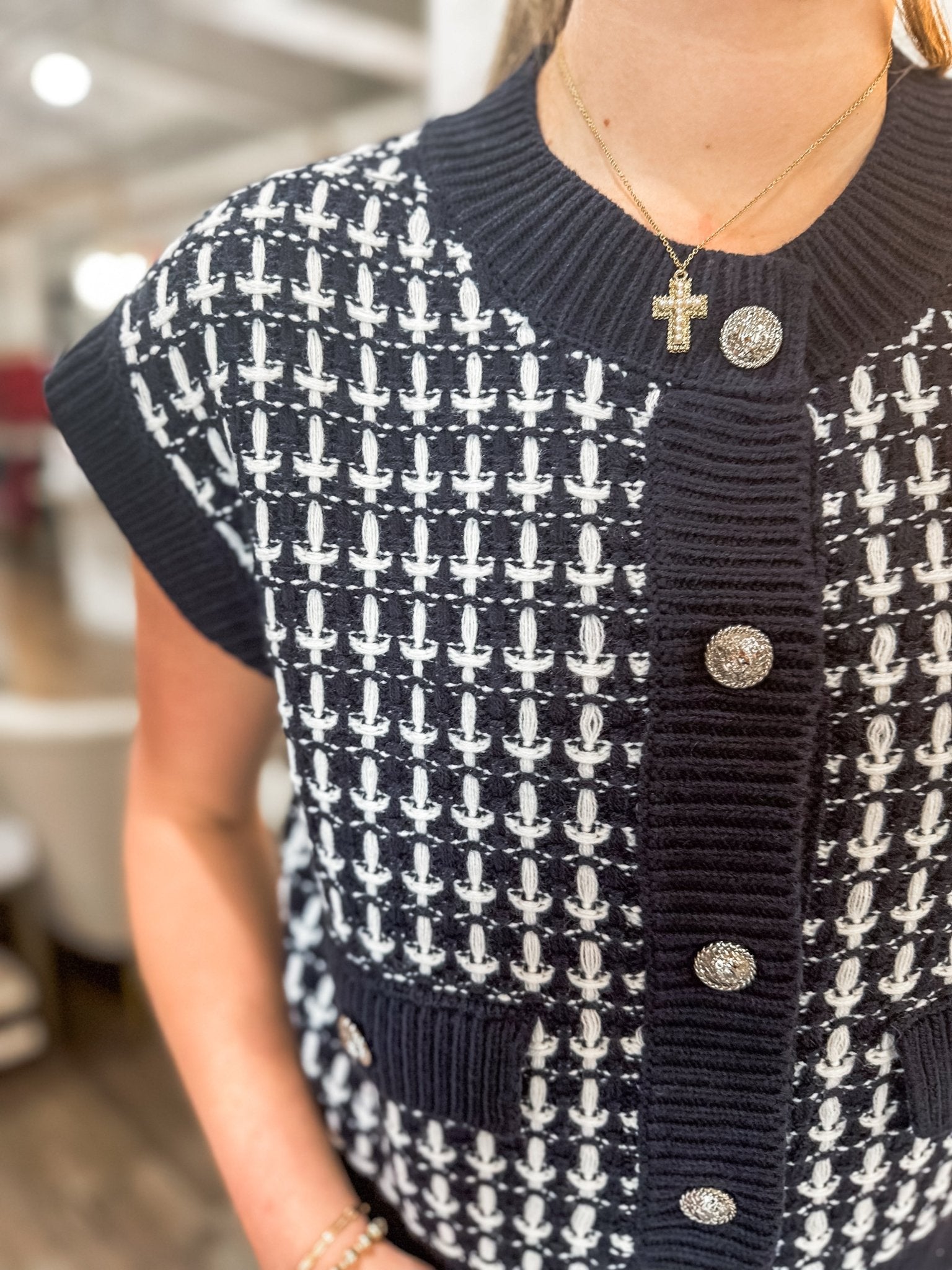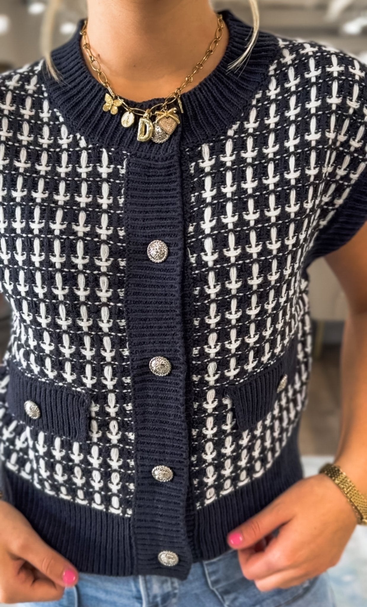 A chic layering piece with a festive touch, the Navy Tweed & Tinsel Sweater Vest blends cozy knit texture with classic tweed-inspired style. Its rich blue base is accented by a cream pattern and subtle metallic threads for a hint of shimmer. Silver statement buttons and faux front pockets add a polished, vintage vibe. Perfect over a blouse for the office or layered casually with jeans for the weekend.