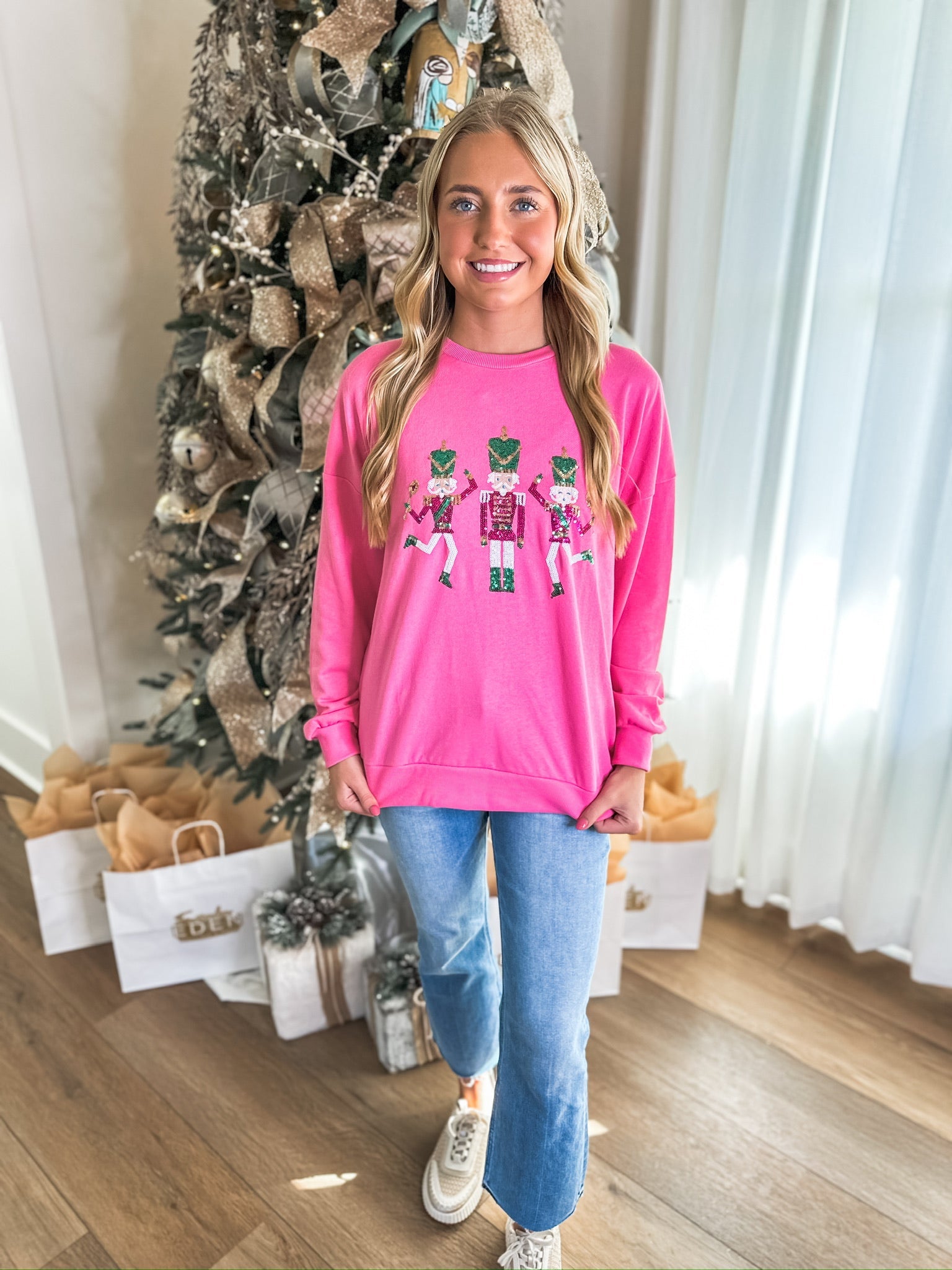 Make spirits bright in this dazzling holiday sweatshirt that’s merry, pink, and perfectly playful! Featuring a trio of sequined nutcrackers dancing across the front, it’s the ultimate statement piece for festive fun.