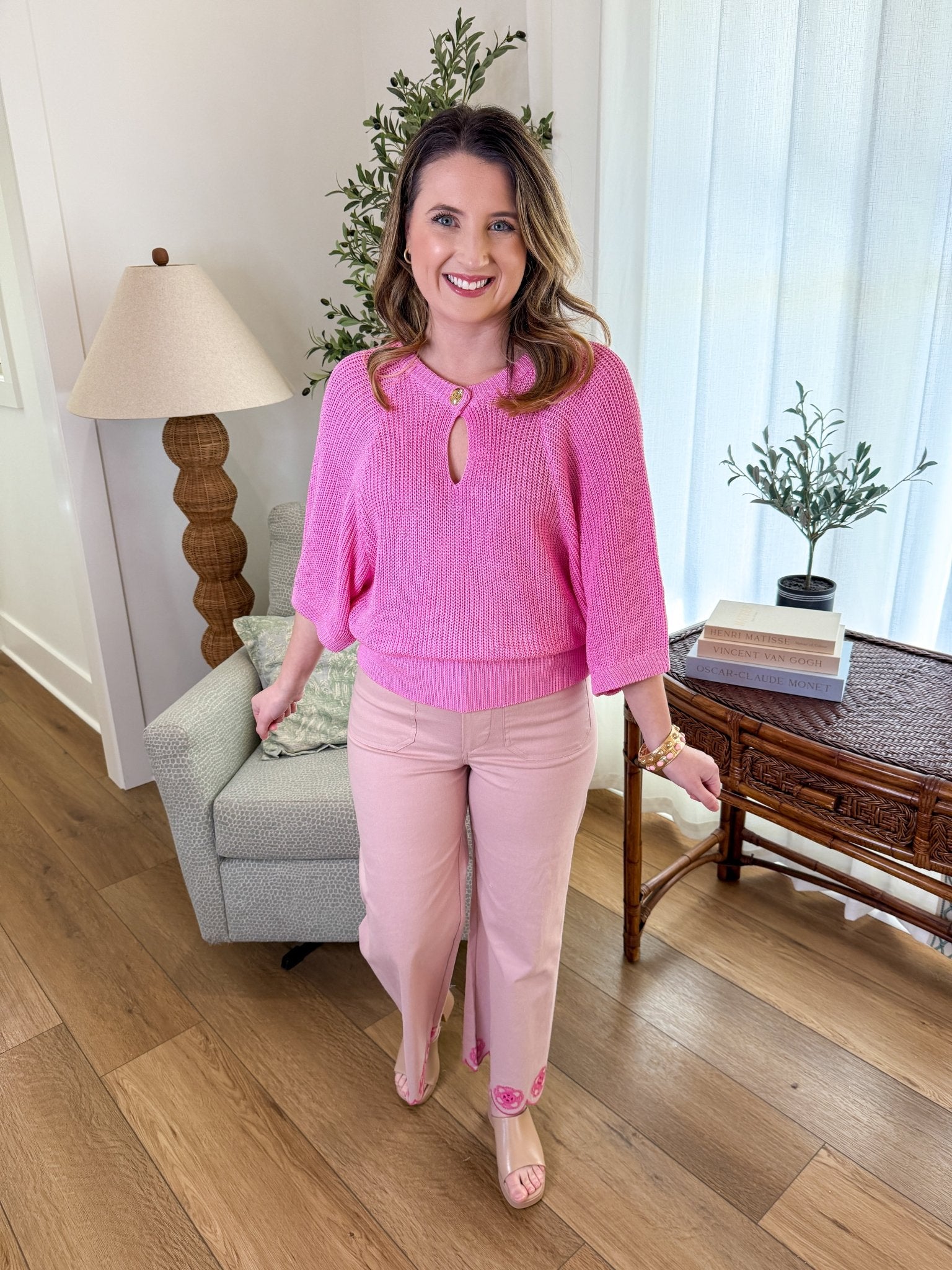 Design: Lightweight knit sweater featuring a rounded neckline with a delicate keyhole detail, relaxed fit, and easy three-quarter length sleeves.