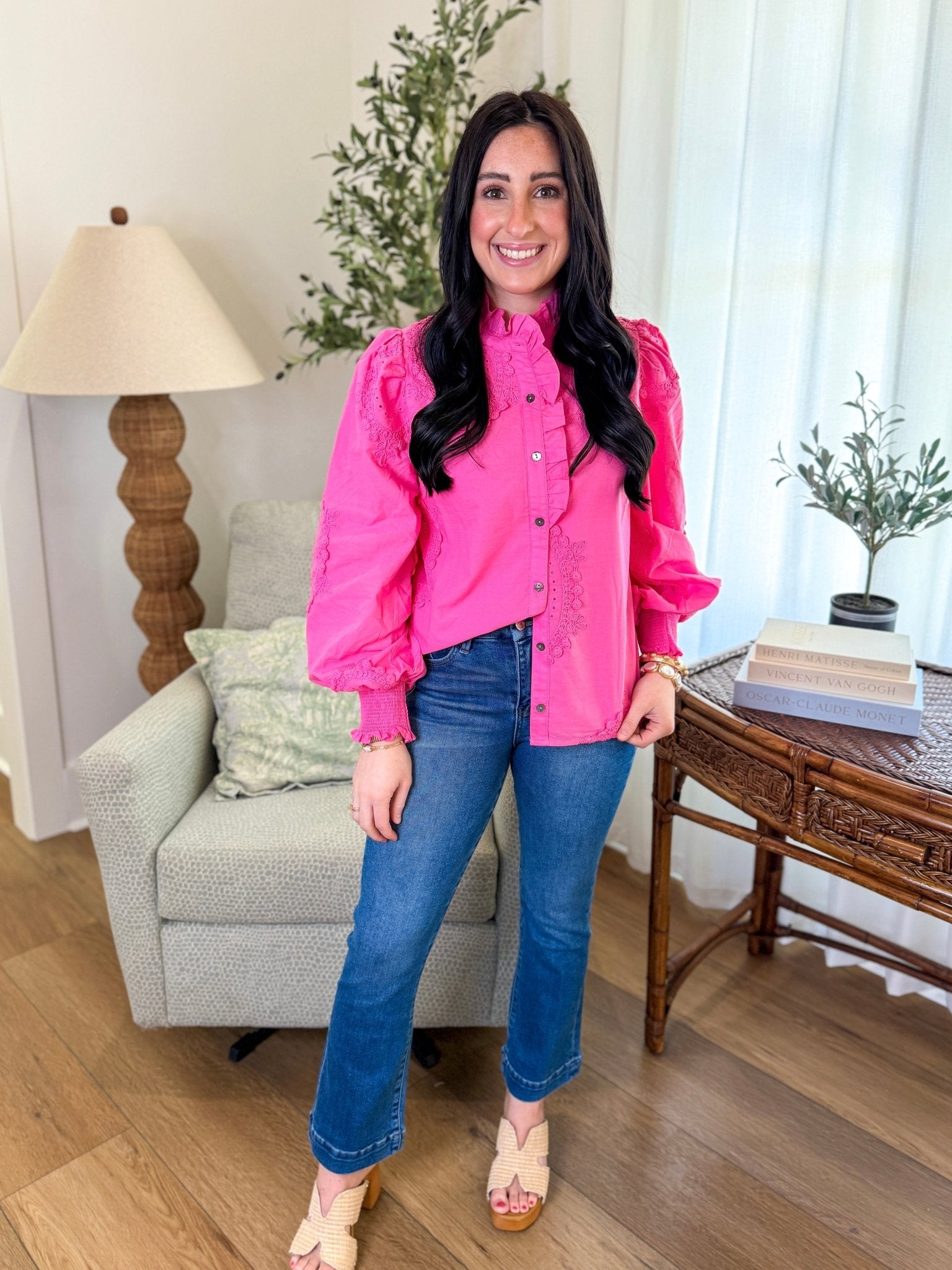 The Pink Lucky Lace Embroidered Button-Down Blouse is the perfect mix of feminine detail and everyday polish. With delicate embroidery and a soft, romantic silhouette, this top instantly elevates denim while still feeling easy and wearable.