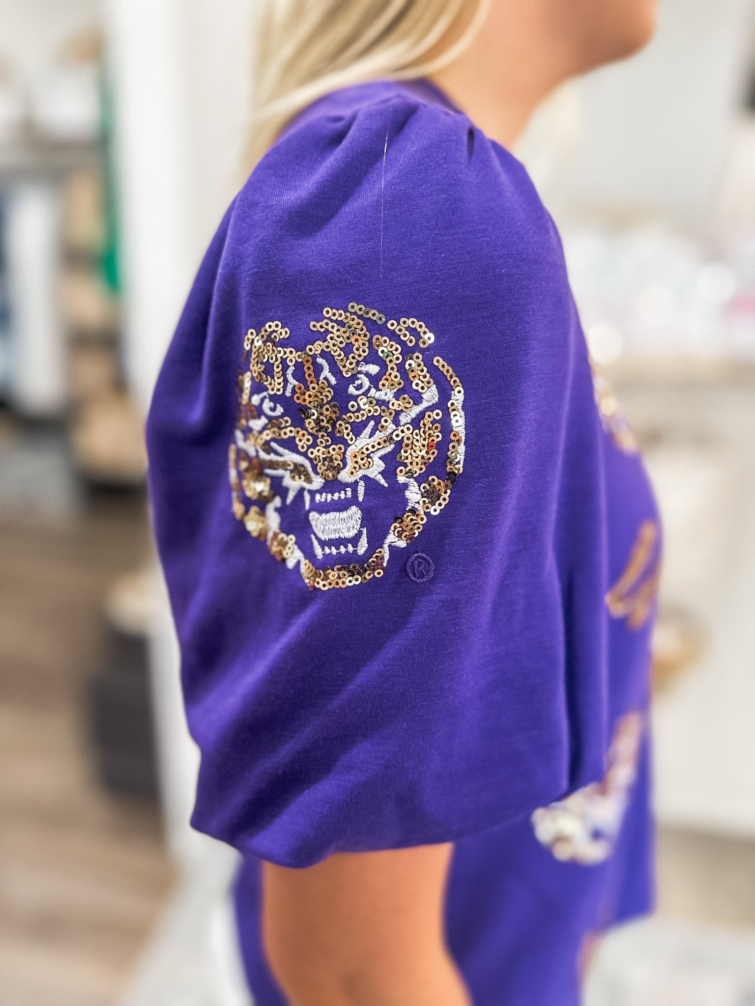 Game day just got a glam upgrade! Whether you're cheering from the stands or celebrating from the tailgate, this sparkling LSU tee brings the spirit and the shine. It’s the perfect blend of comfy and bold for your Tiger game day lineup.