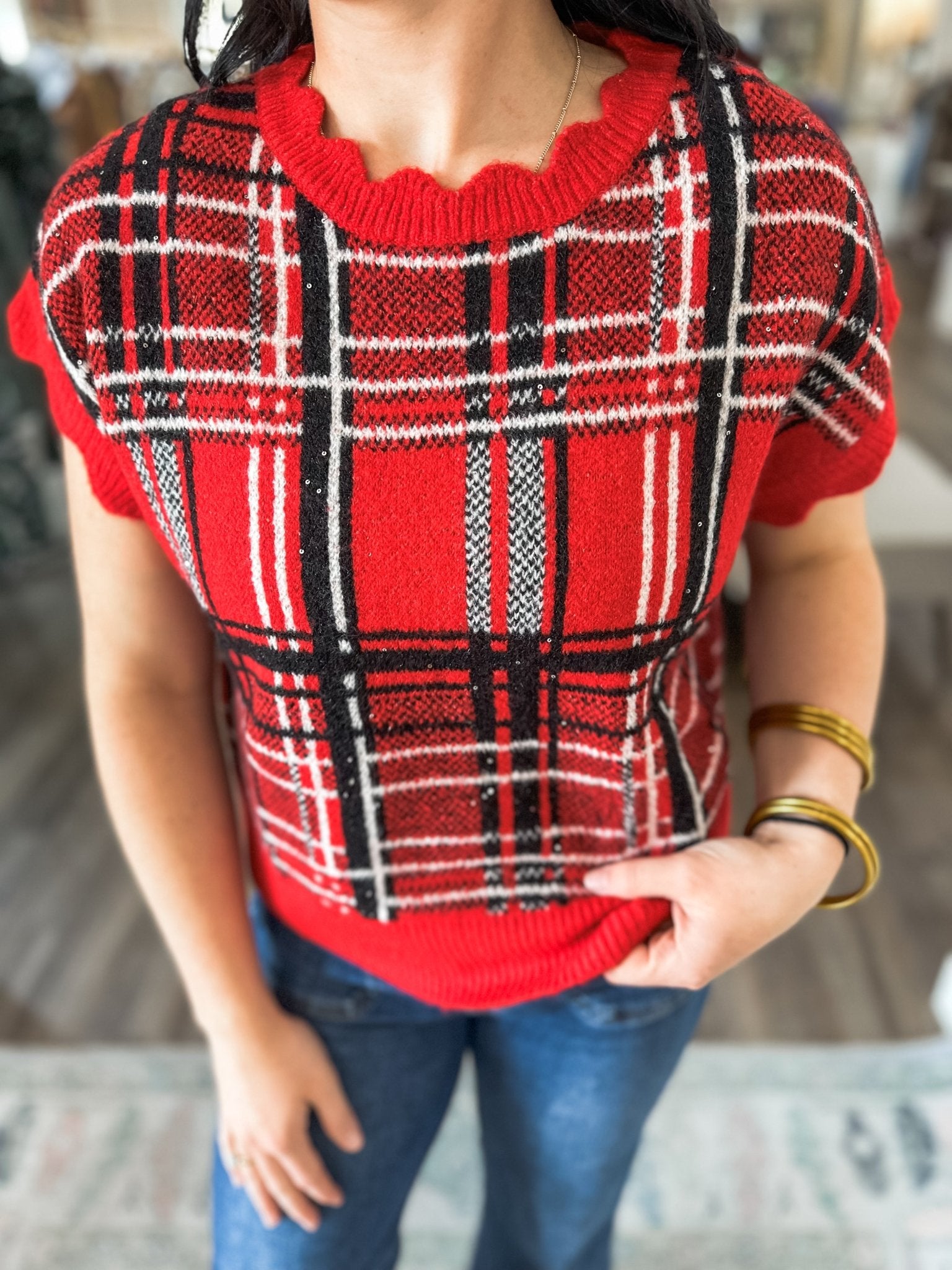 Bring on the festive cheer with the Red Holiday Sparkle Plaid Knit Top — a playful piece that combines cozy knitwear with holiday sparkle. The bright red plaid design is woven with subtle metallic threads, making it perfect for both casual celebrations and dressed-up holiday fun.