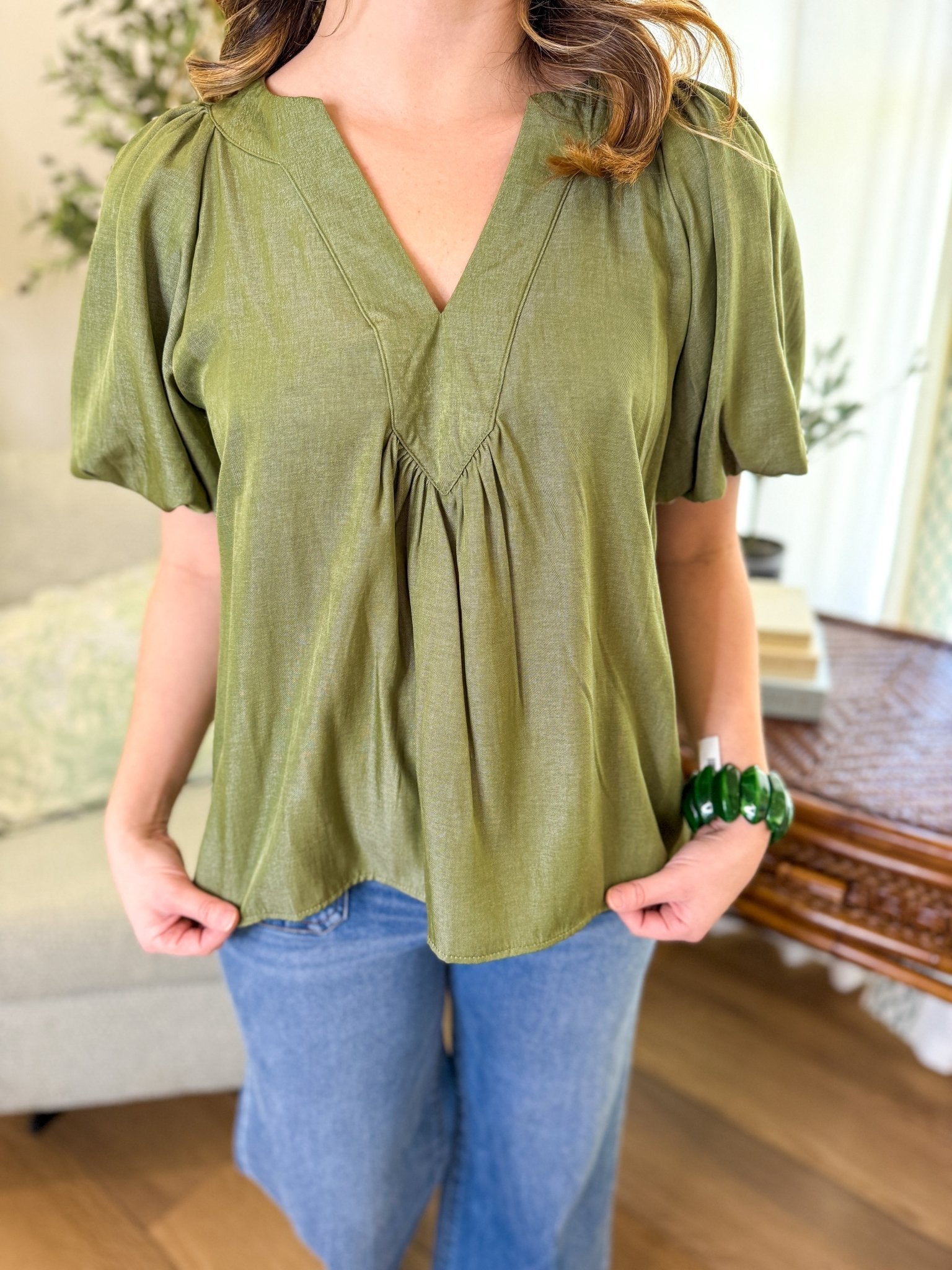 Design: V-neckline with subtle pleating at the front, relaxed fit, and softly gathered balloon sleeves for a feminine touch.