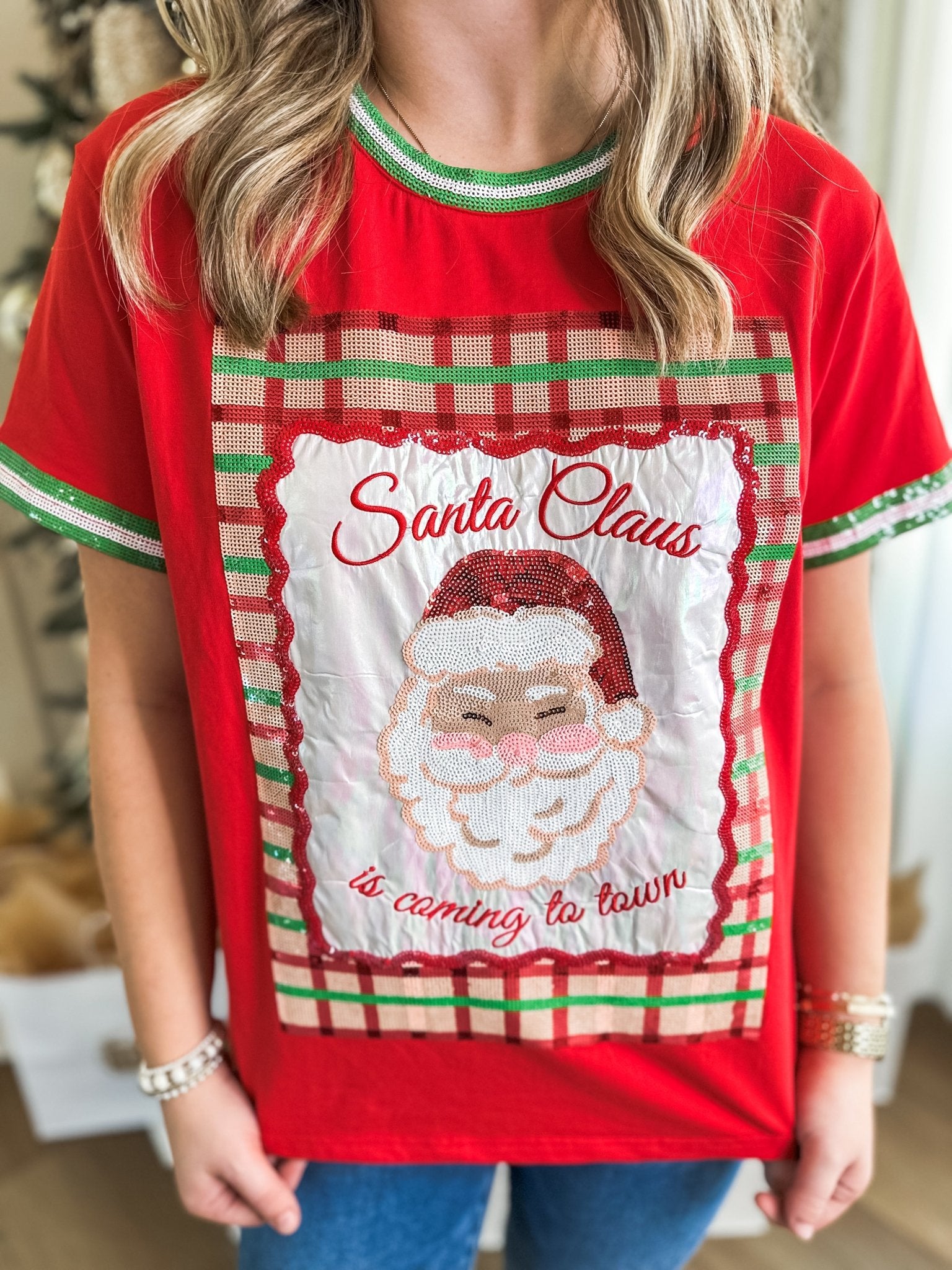 Make spirits bright with this bold, statement-making holiday top! Designed in vibrant red with shimmering sequin accents, this tee features a sparkling Santa Claus framed in festive plaid with the words “Santa Claus is Coming to Town.” Metallic details at the neckline and sleeves add extra charm, making it a merry must-have for Christmas parties, family gatherings, or just spreading cheer all season long.