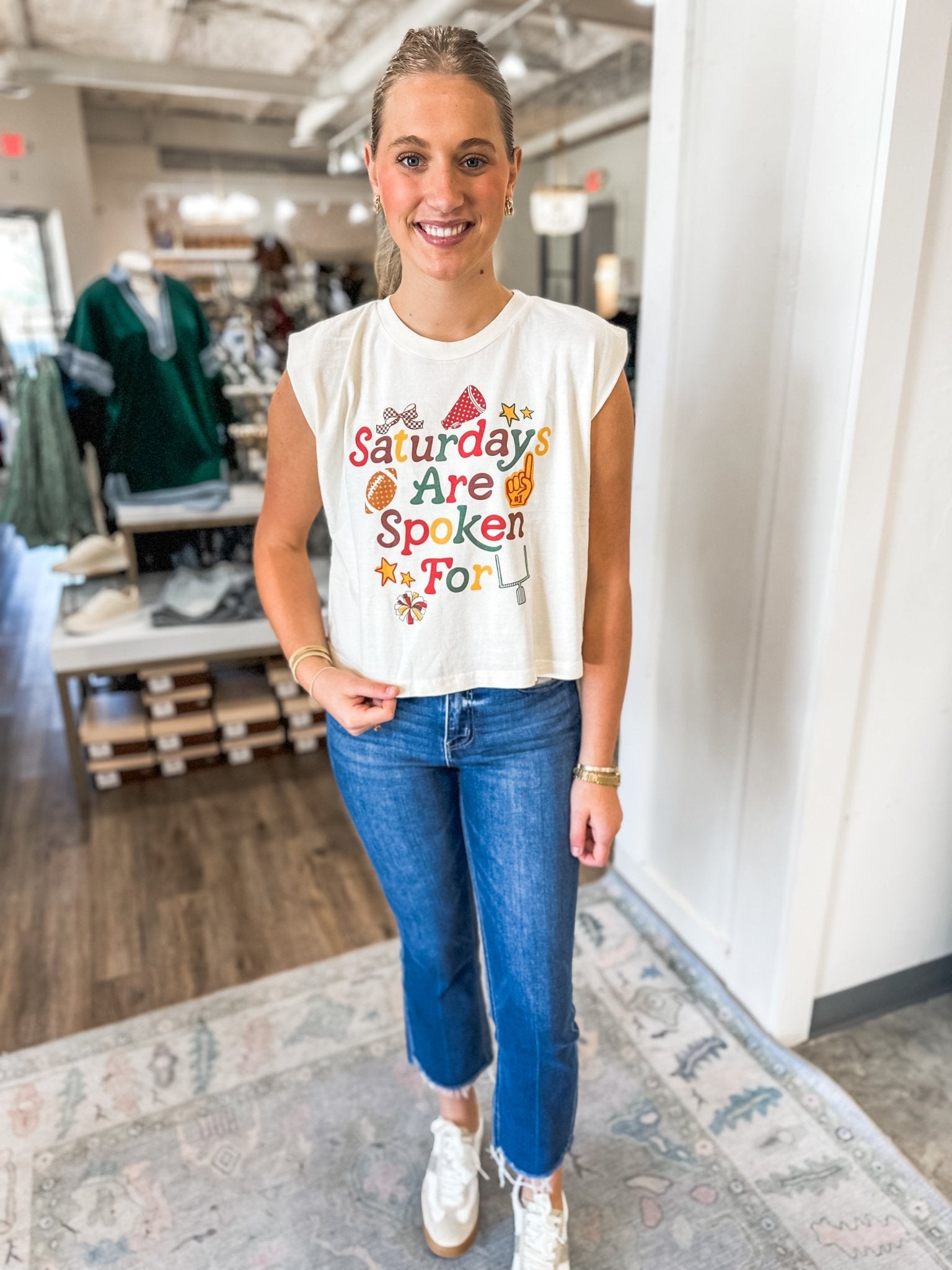 Perfect for game days, tailgates, or casual weekend plans, this fun graphic tank says it all—Saturdays are reserved for football, friends, and fun.