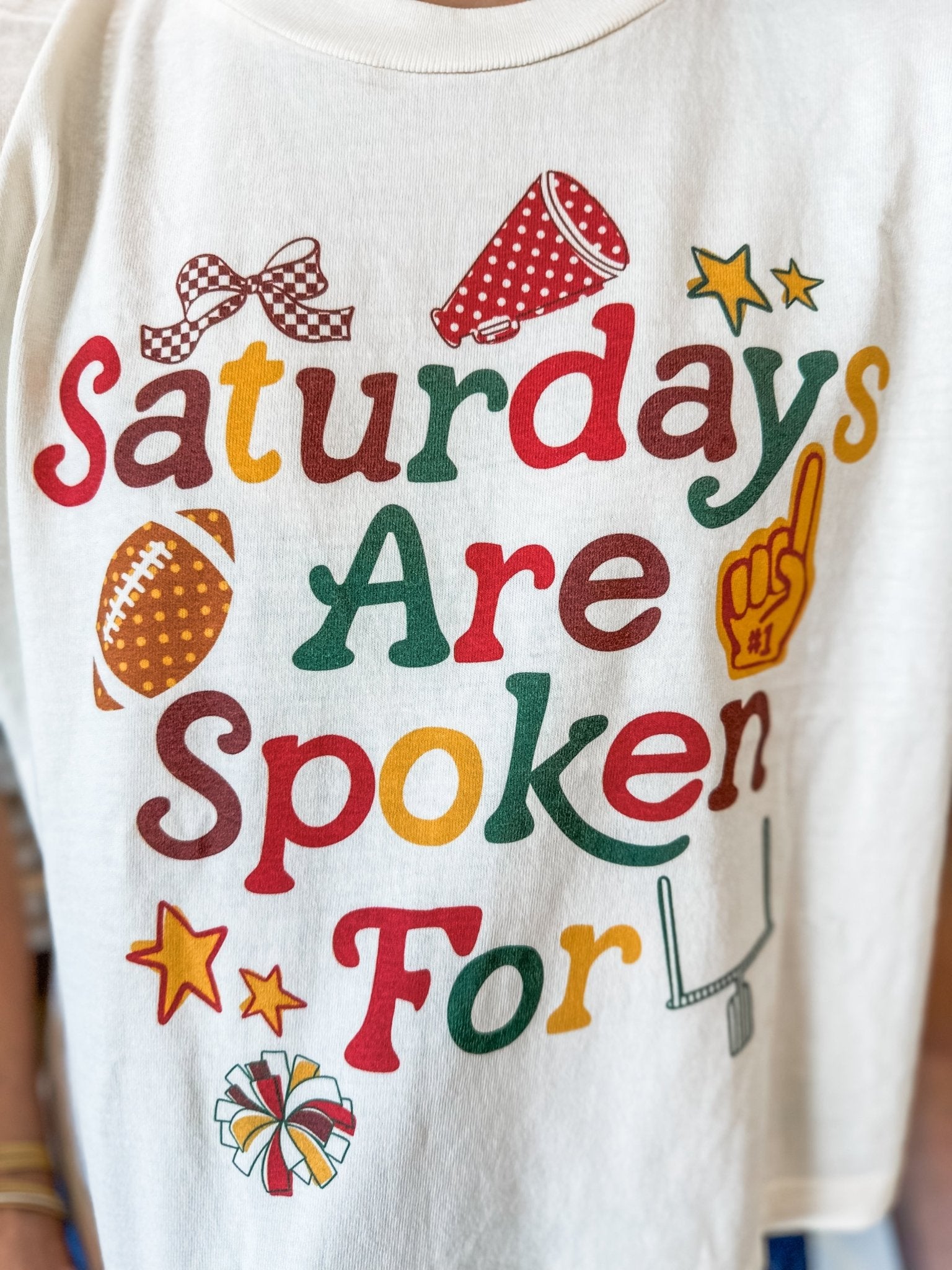 - Cream waffle knit fabric with bold multi-color game day graphic