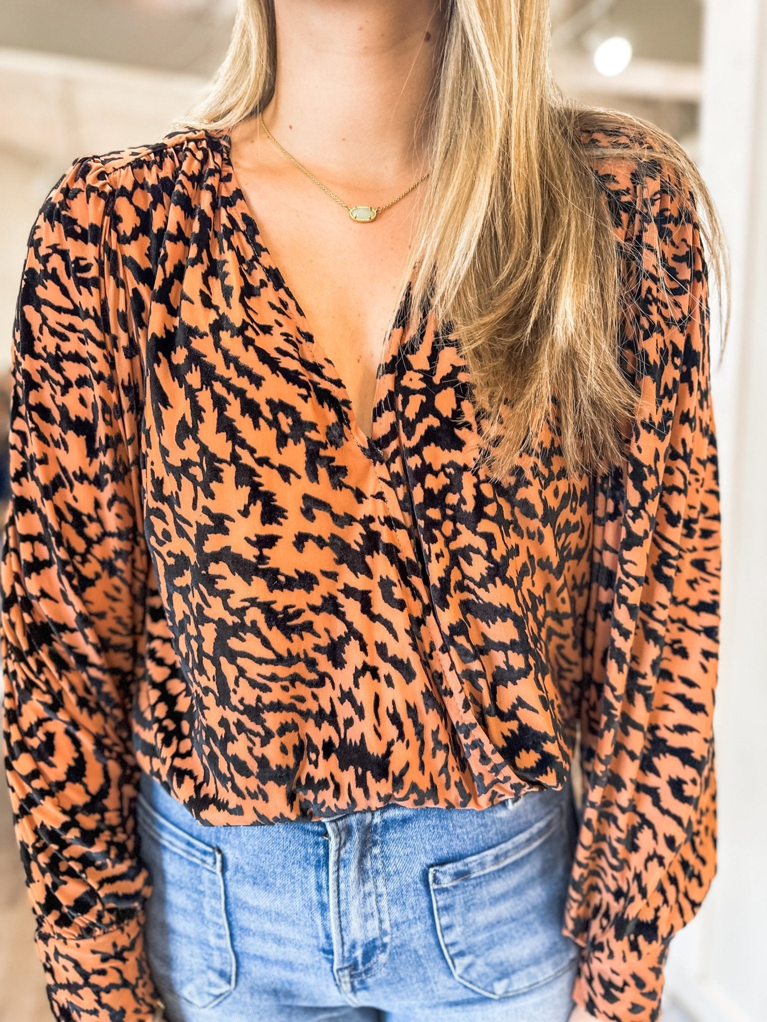 Unleash your fierce side with this stunning velvet detail bodysuit that’s equal parts wild and chic. The bold animal print pairs with a luxe velvety texture, making it a statement piece for both day and night.