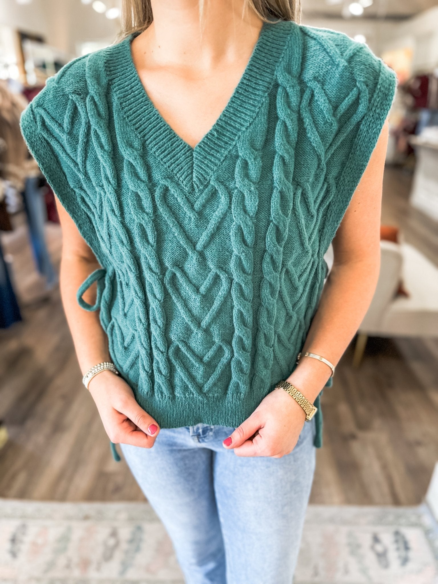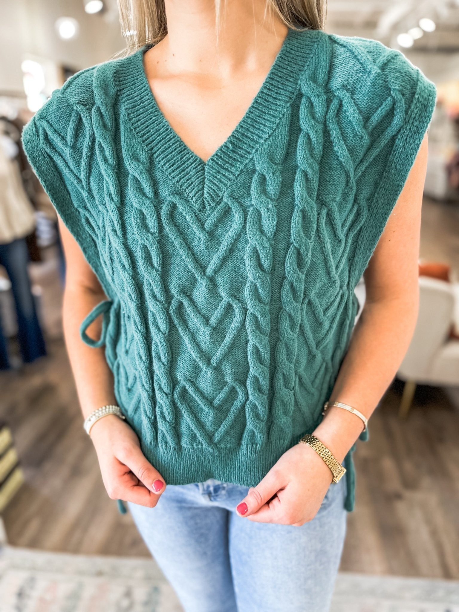 This cozy-chic knit is fall layering at its finest 🍂 Featuring a soft cable pattern throughout and darling side tie details, the Slate Green Fall Thread Sweater Top blends comfort with charm. The sleeveless cut and relaxed fit make it a perfect transitional piece — style it solo now or layer it later. Pairs perfectly with high-waisted denim or wide-leg pants for a casual-yet-polished look.