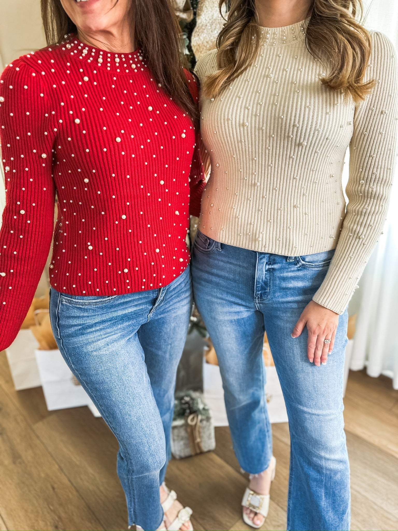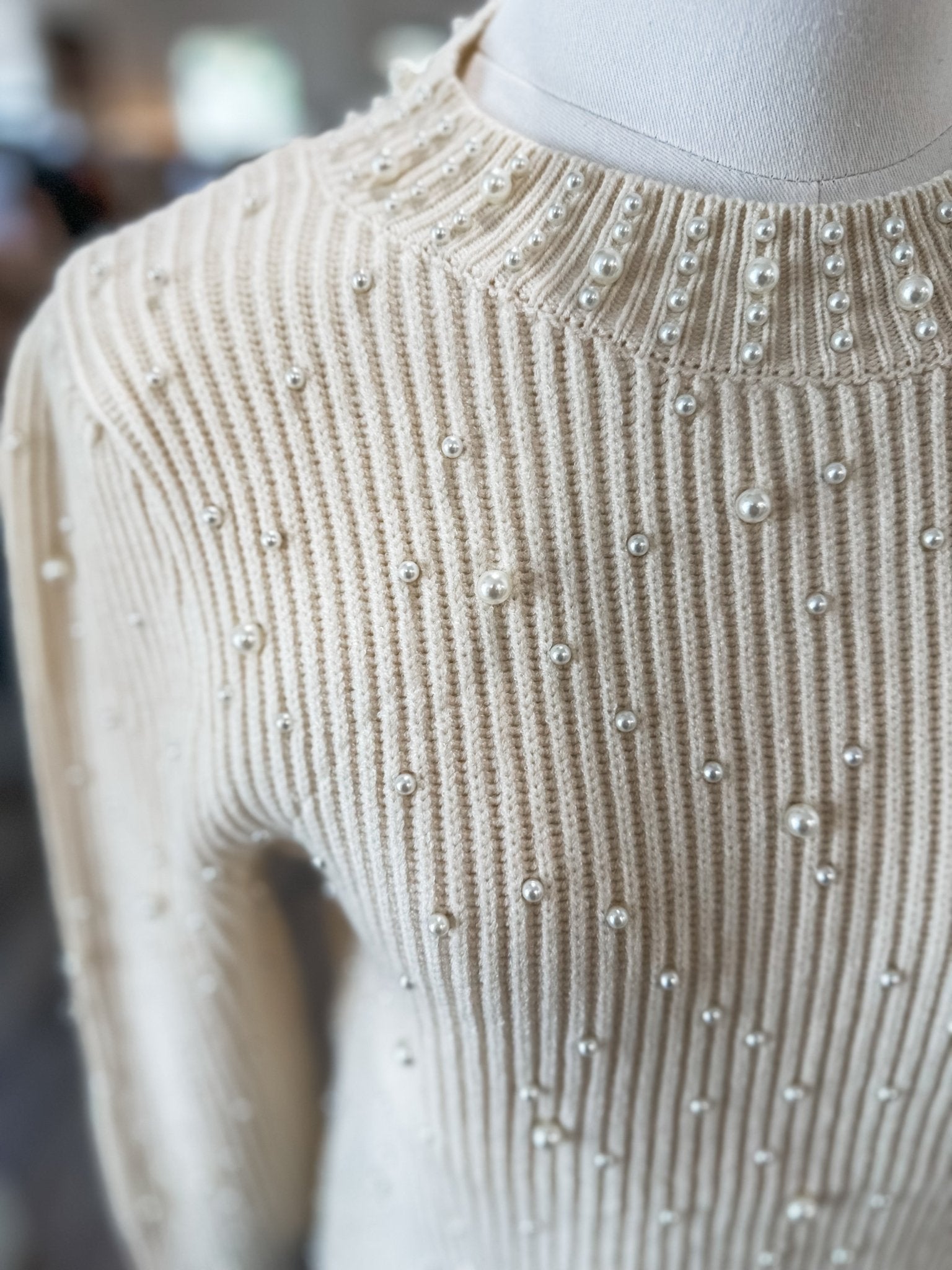This dreamy sweater is as elegant as a fresh snowfall. Adorned with delicate pearls, it’s perfect for holiday gatherings, winter photos, or adding a touch of sparkle to everyday outfits.
