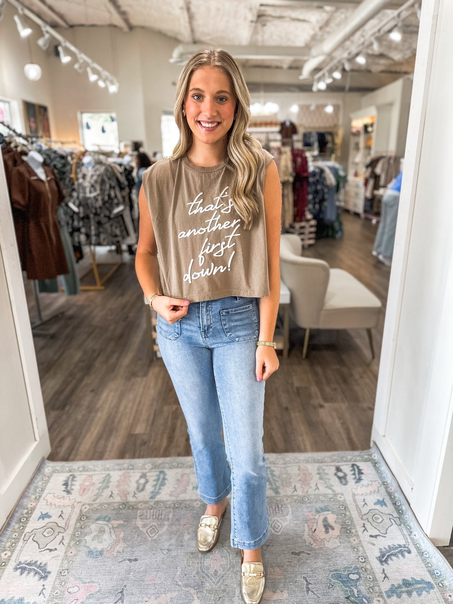 Game day just got even better with this neutral puff print tank! Whether you’re tailgating, cheering from the stands, or styling it casually for the weekend, this top is the perfect mix of sporty + chic.
