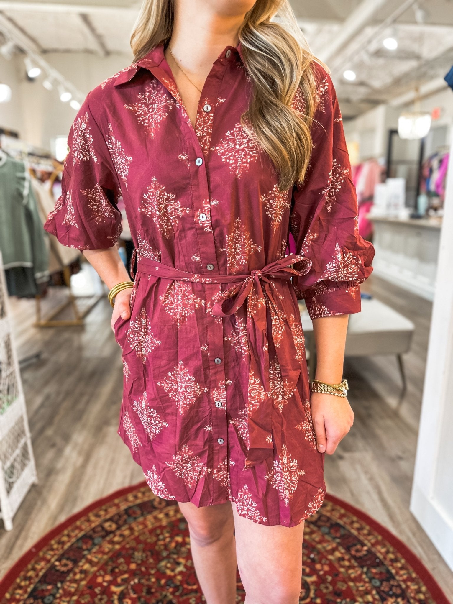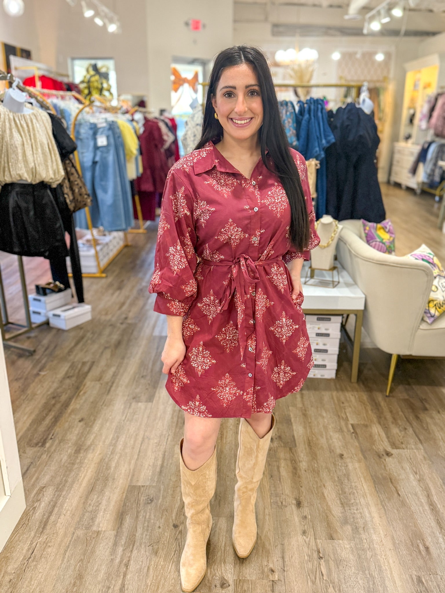 A fall-ready showstopper! The Burgundy Vivian Vineyard Dress features a gorgeous vineyard-inspired print on a rich burgundy base, giving it the perfect blend of chic + seasonal charm. The button-front design keeps it classic, while the adjustable waist tie creates the most flattering silhouette. Puff sleeves add that extra feminine detail we love.