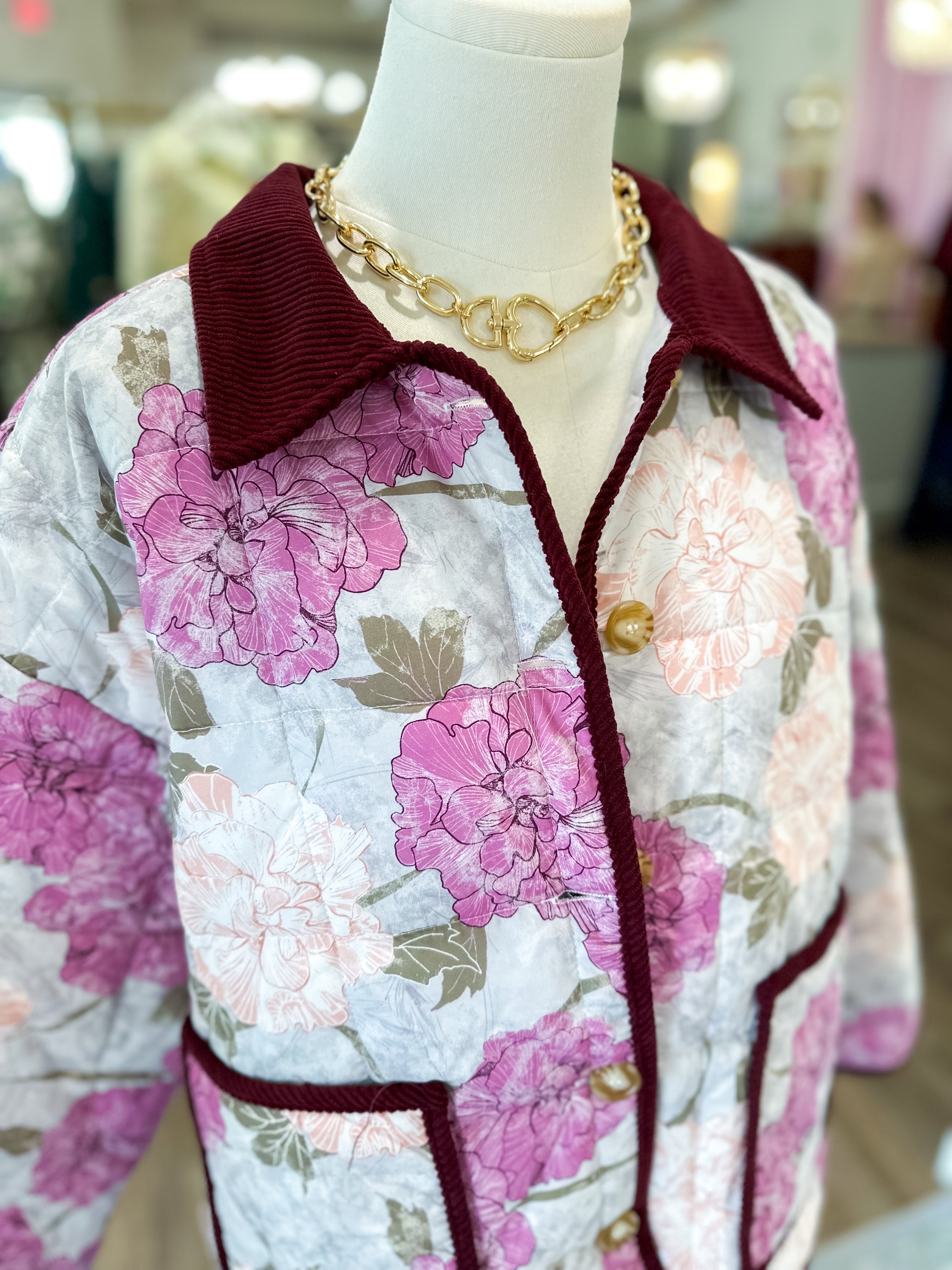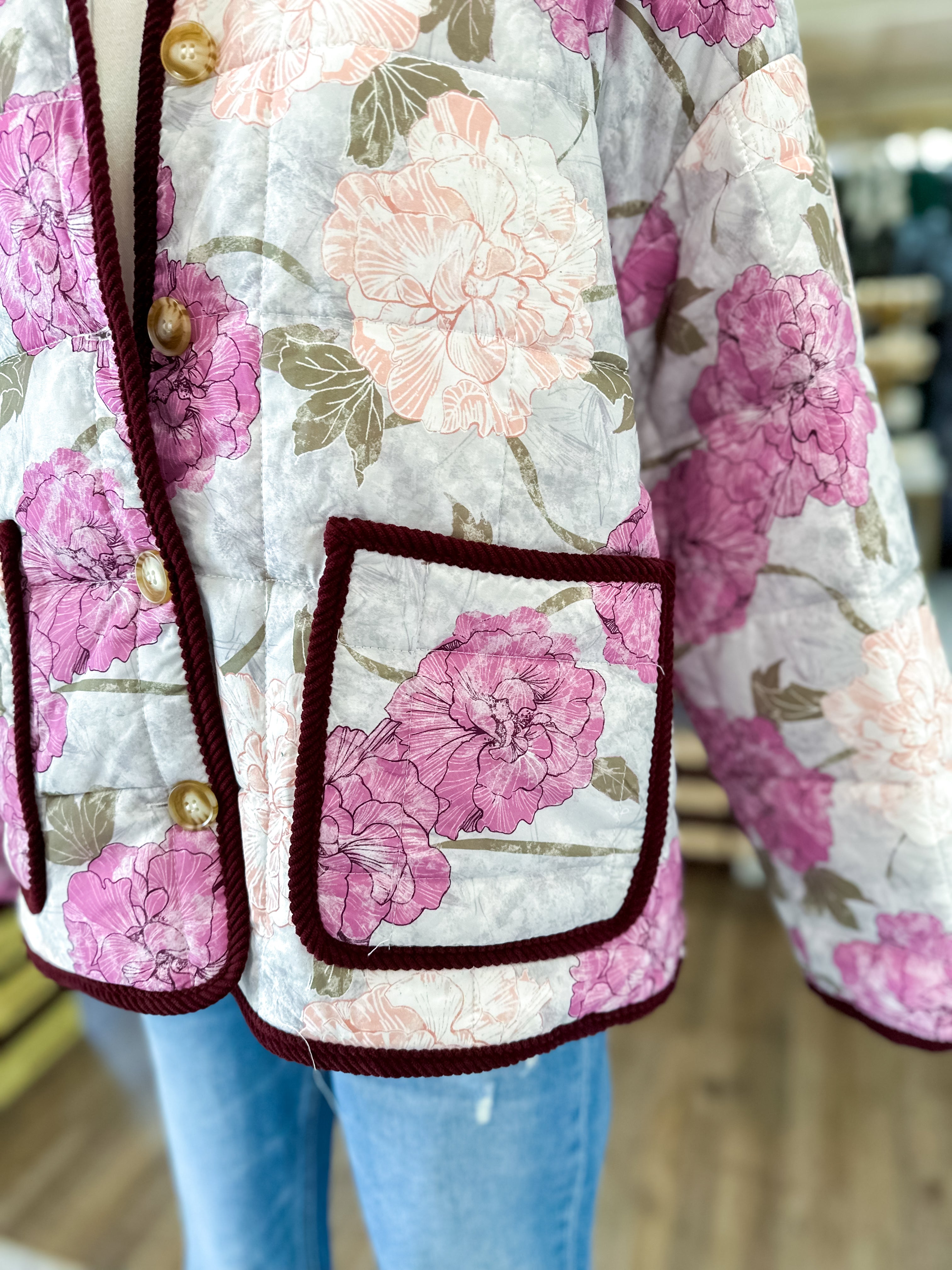 Bring cozy cottage charm into your wardrobe with this quilted floral jacket that layers beautifully for cooler days.