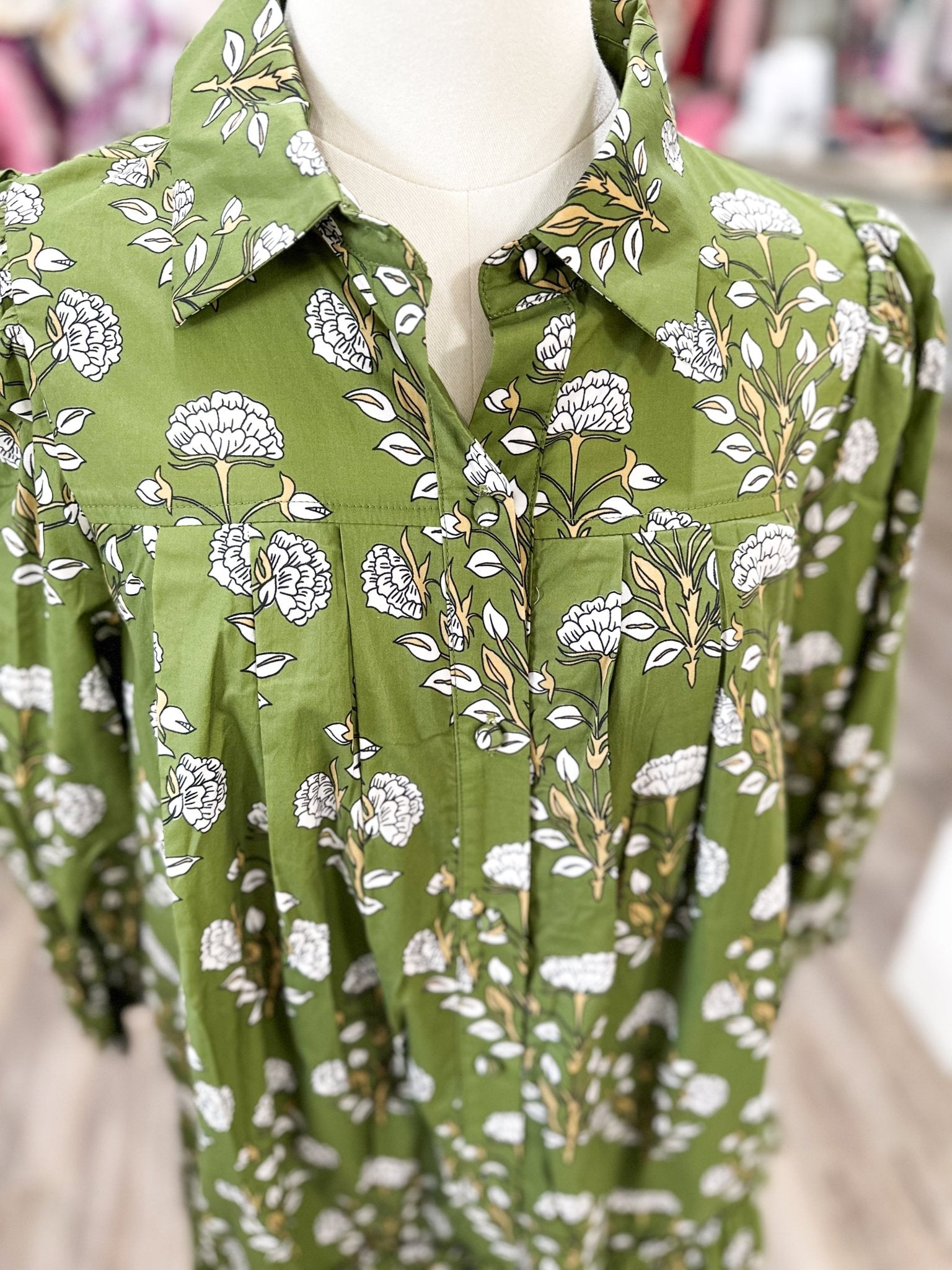 Fresh, feminine, and effortlessly pretty, this mini dress features a soft fern-green base with a delicate floral blossom print that feels perfect for transitioning seasons. Easy to dress up or down, it’s a go-to piece for brunch dates, casual gatherings, or everyday wear.