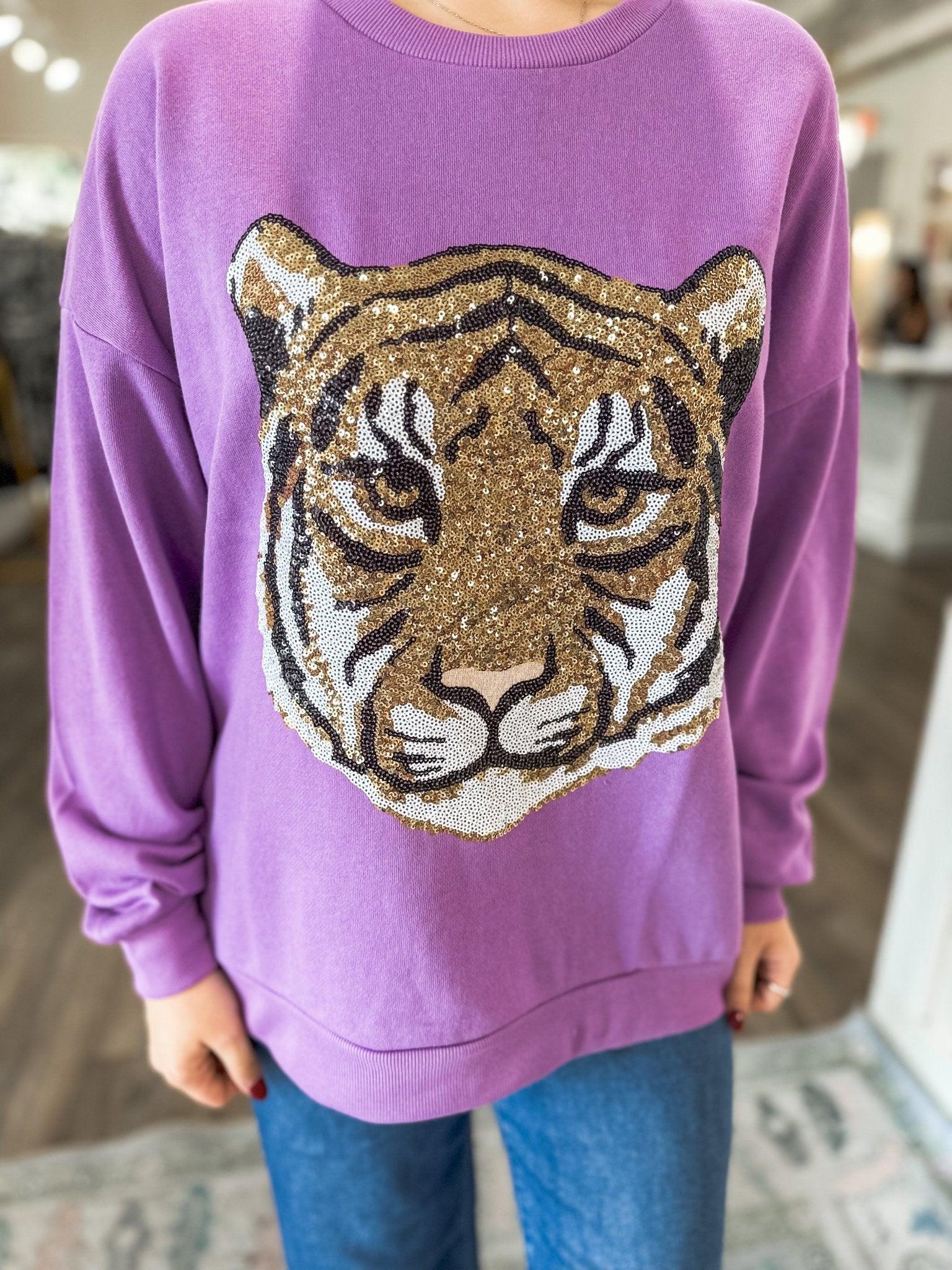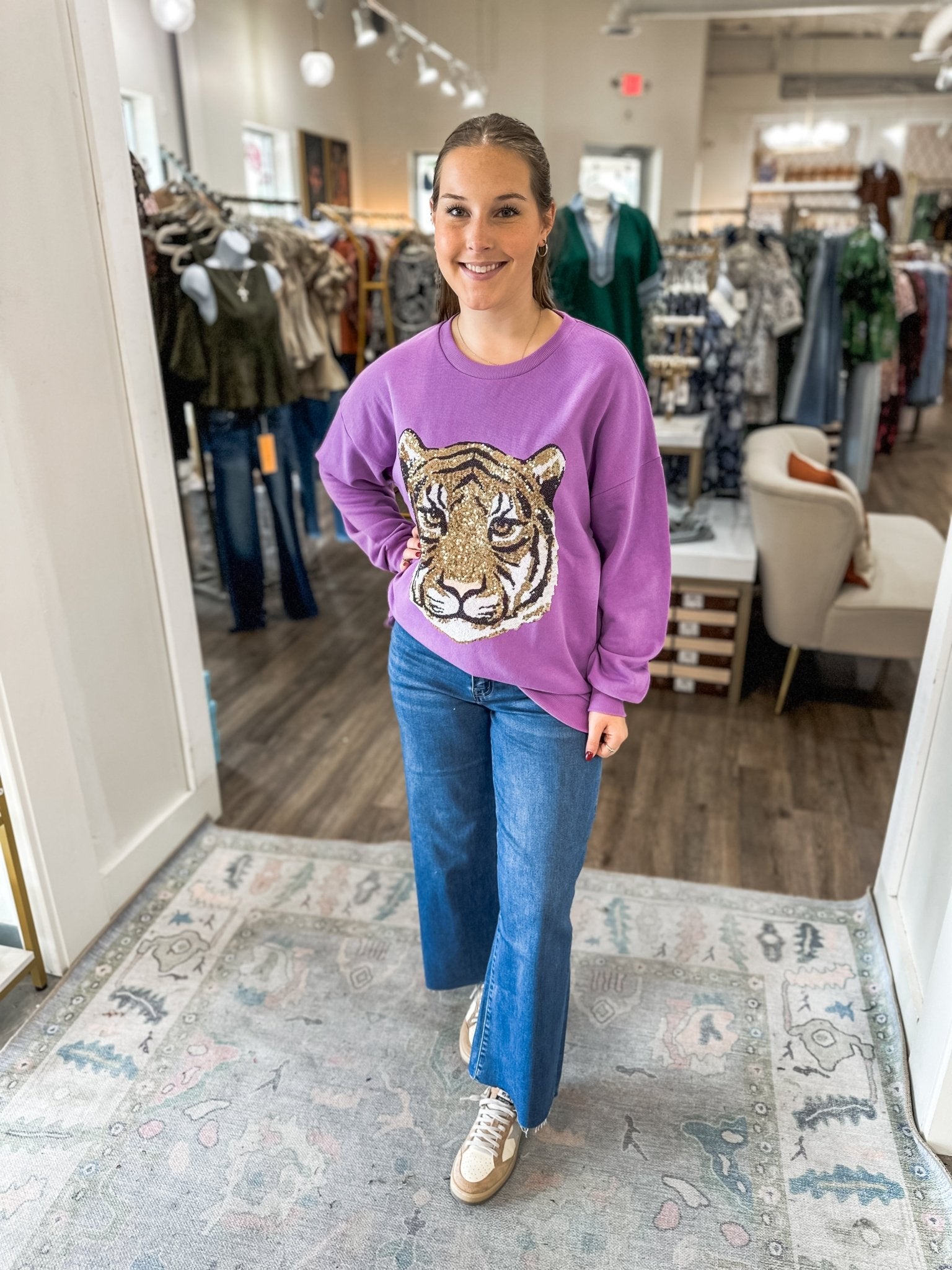Game day glam meets cozy comfort! ✨ Whether you’re cheering from the stands or styling it for a casual weekend, this sequin tiger design adds the perfect pop of sparkle and spirit. The bold lavender hue makes it a standout piece you’ll reach for again and again.