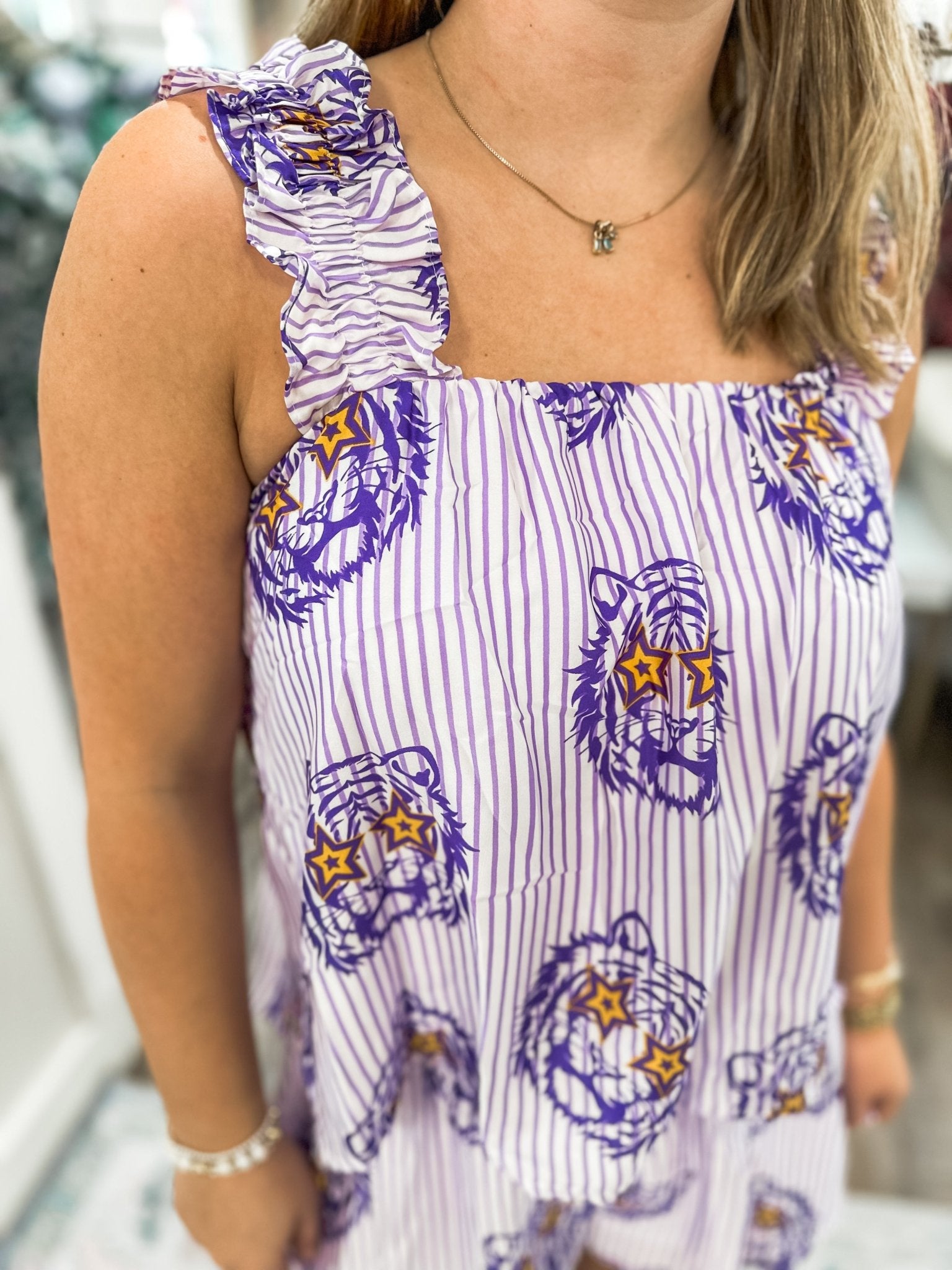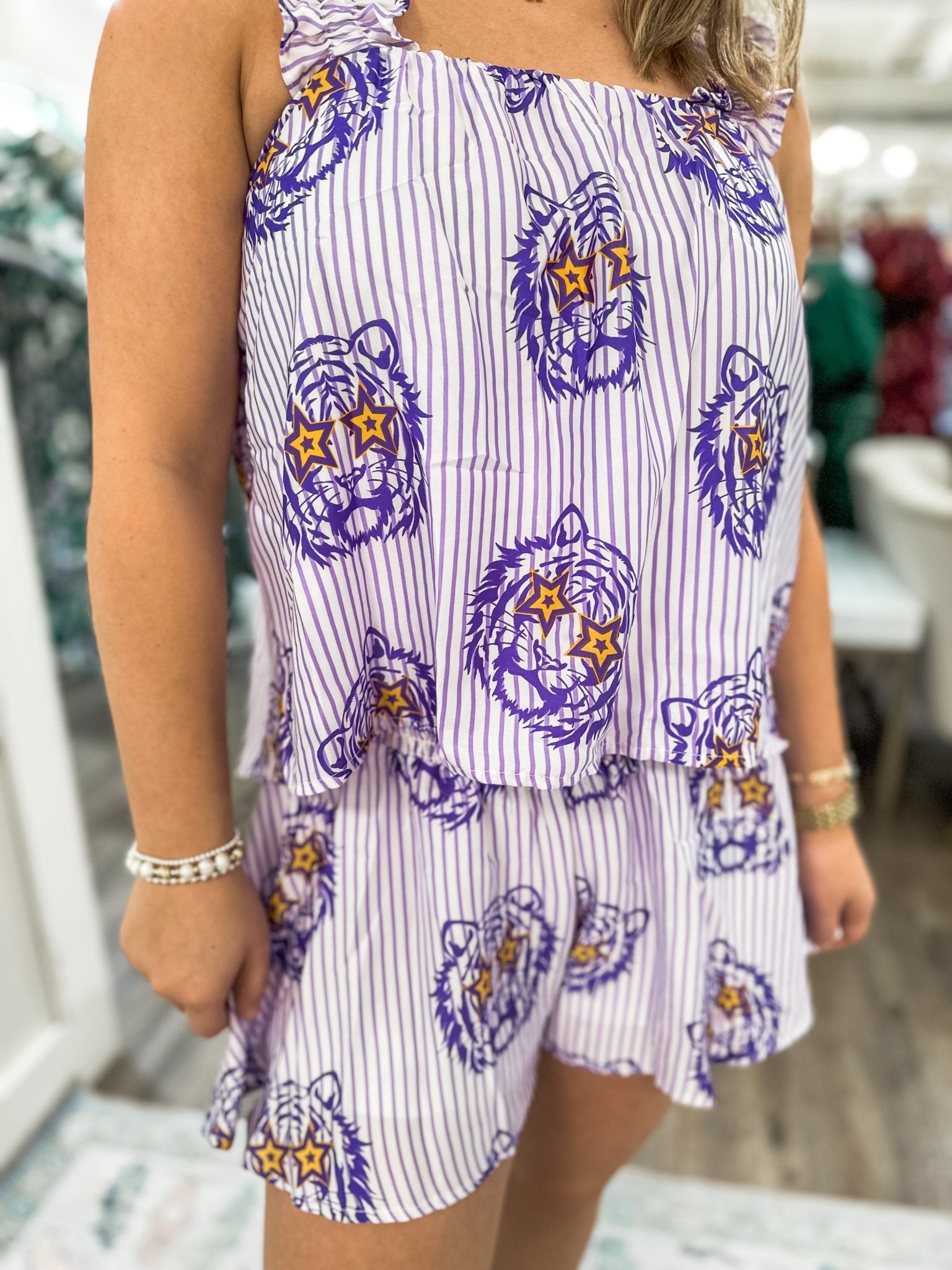 Bring the fun to gameday with the Tiger Time Tank — a playful, lightweight top made for cheering in style. Its bold purple-and-gold tiger print and easy fit make it the perfect statement piece for hot game days or casual weekend plans. Designed with ruffled elastic straps and a flowy silhouette, this tank pairs perfectly with denim shorts or the matching Tiger Time Swing Shorts for a coordinated look.