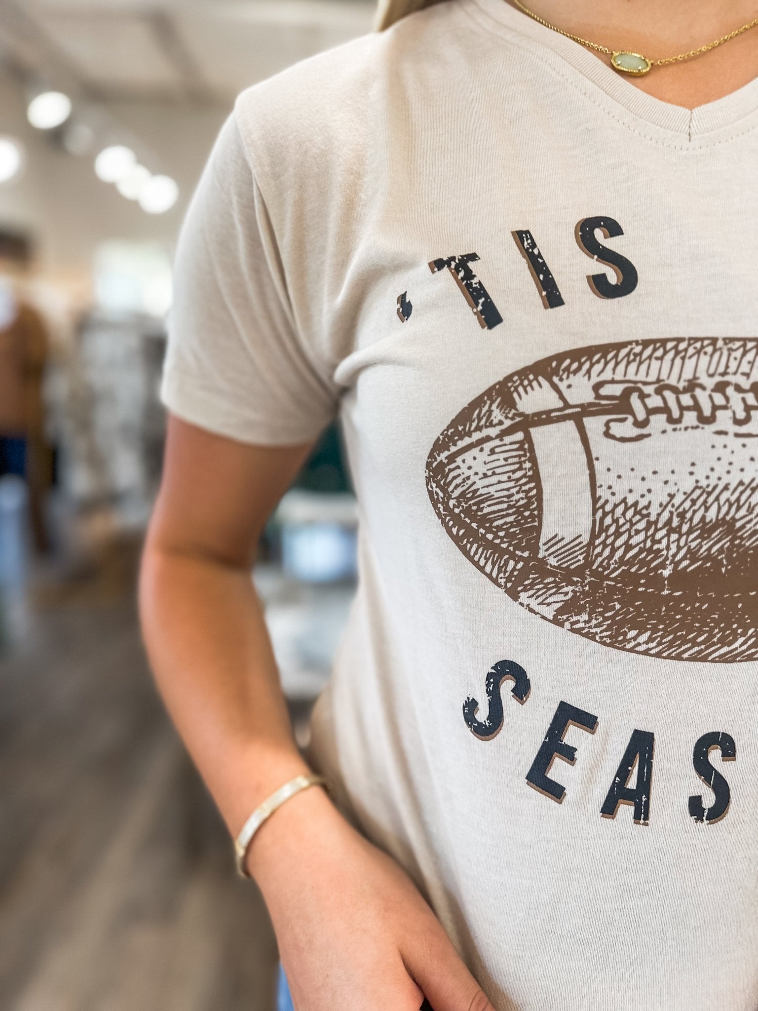Fall means football, and this tee says it all! Our soft and lightweight ‘Tis The Season graphic tee is perfect for Friday night lights, weekend tailgates, or couch-side cheering. With a neutral sand tone and distressed lettering, it pairs effortlessly with denim or leggings for a laid-back gameday look.