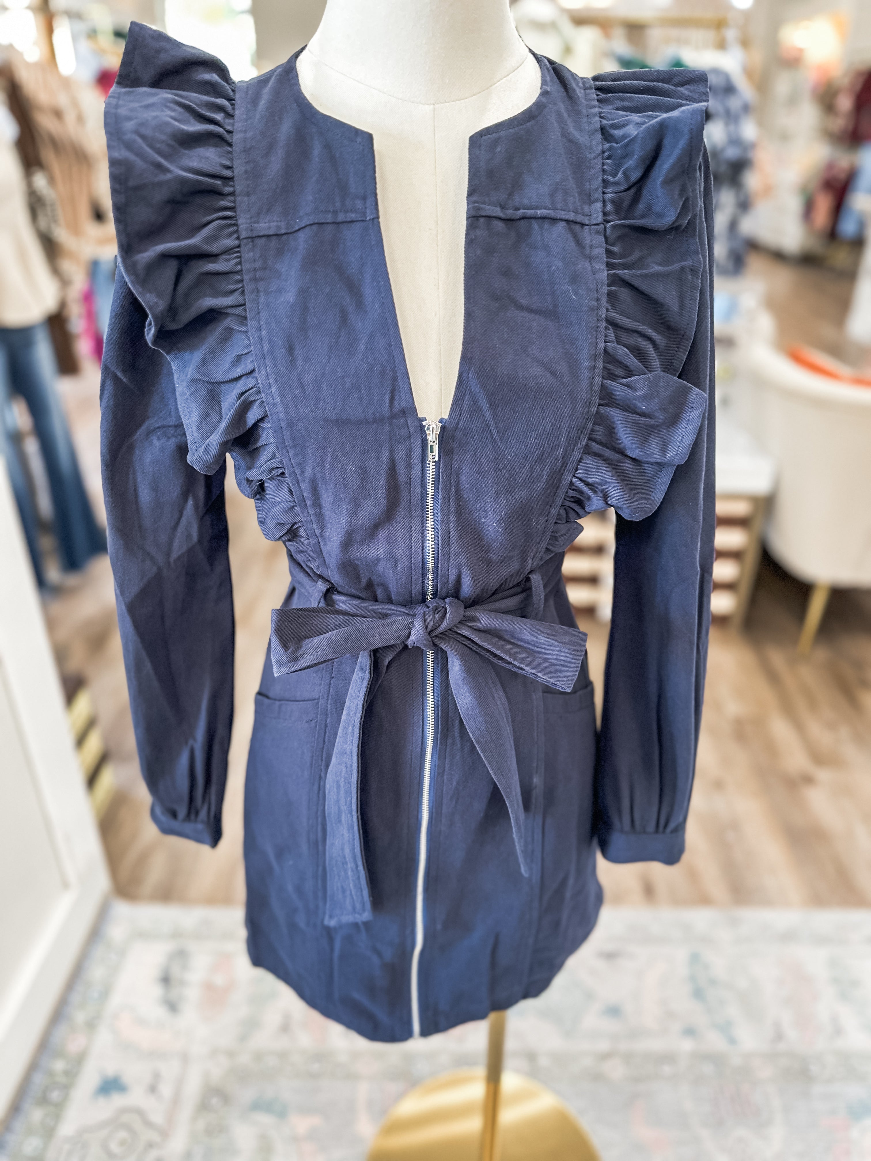 Chic, structured, and just the right amount of flirty — this navy mini dress is the perfect pick for your next night out or fall event. The ruffle shoulder detail and tie waist create a feminine, flattering silhouette that moves beautifully with you.