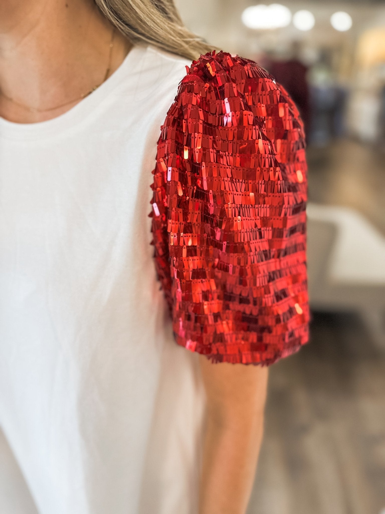 Bring the heat and the sparkle to your next tailgate with this bold and festive shift dress! Featuring vibrant red and black sequin puff sleeves, this dress is a showstopper whether you’re cheering from the stands or celebrating at home. A crisp white body keeps it classic while the glam sleeves do all the talking.