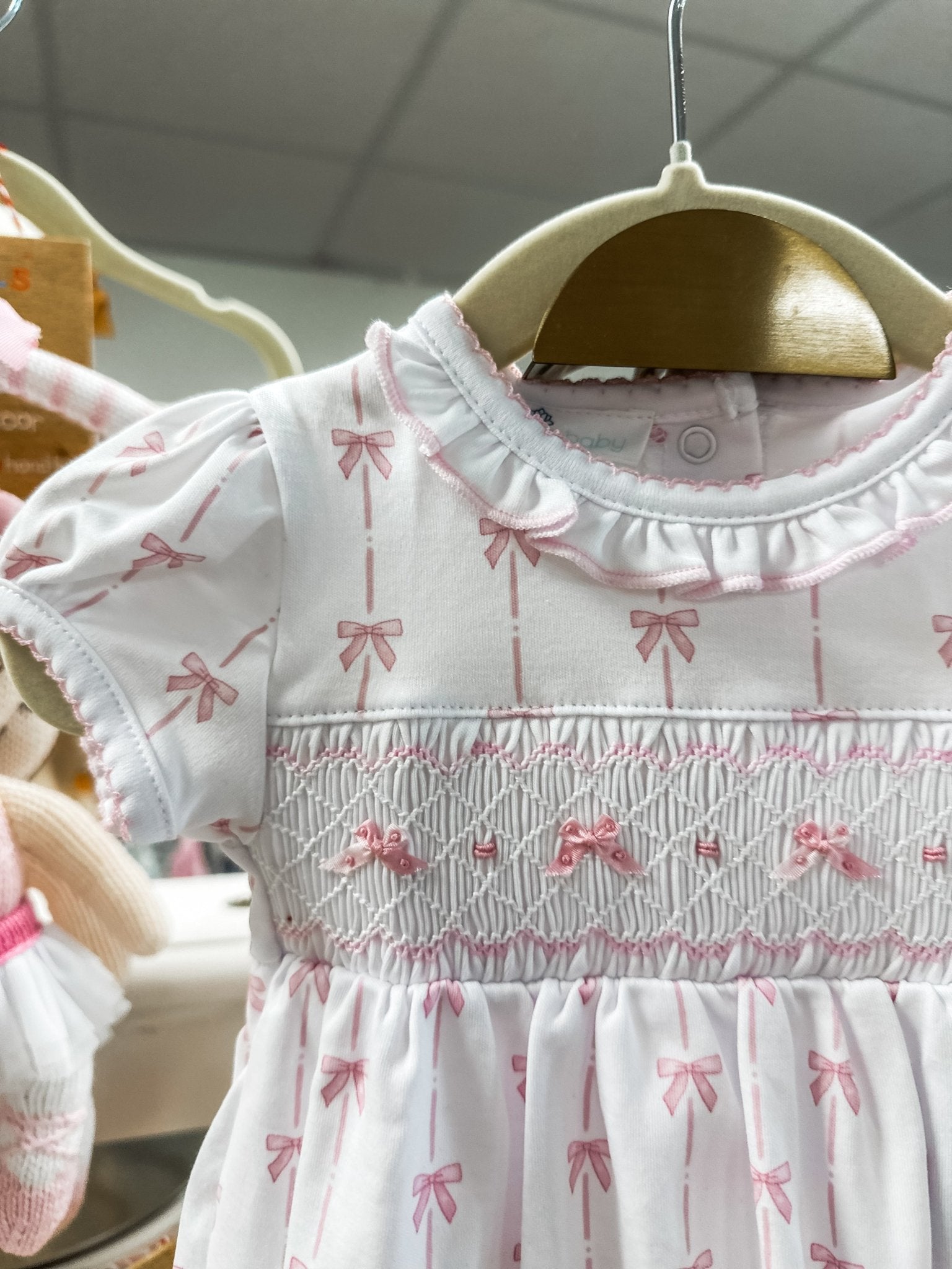 The Amelia’s Classics Smocked Girl Bubble features hand-smocked pink bows across the chest, a soft white base, and gentle puff sleeves for a precious, traditional look. Perfect for portraits, church, or special occasions while keeping baby comfortable all day.