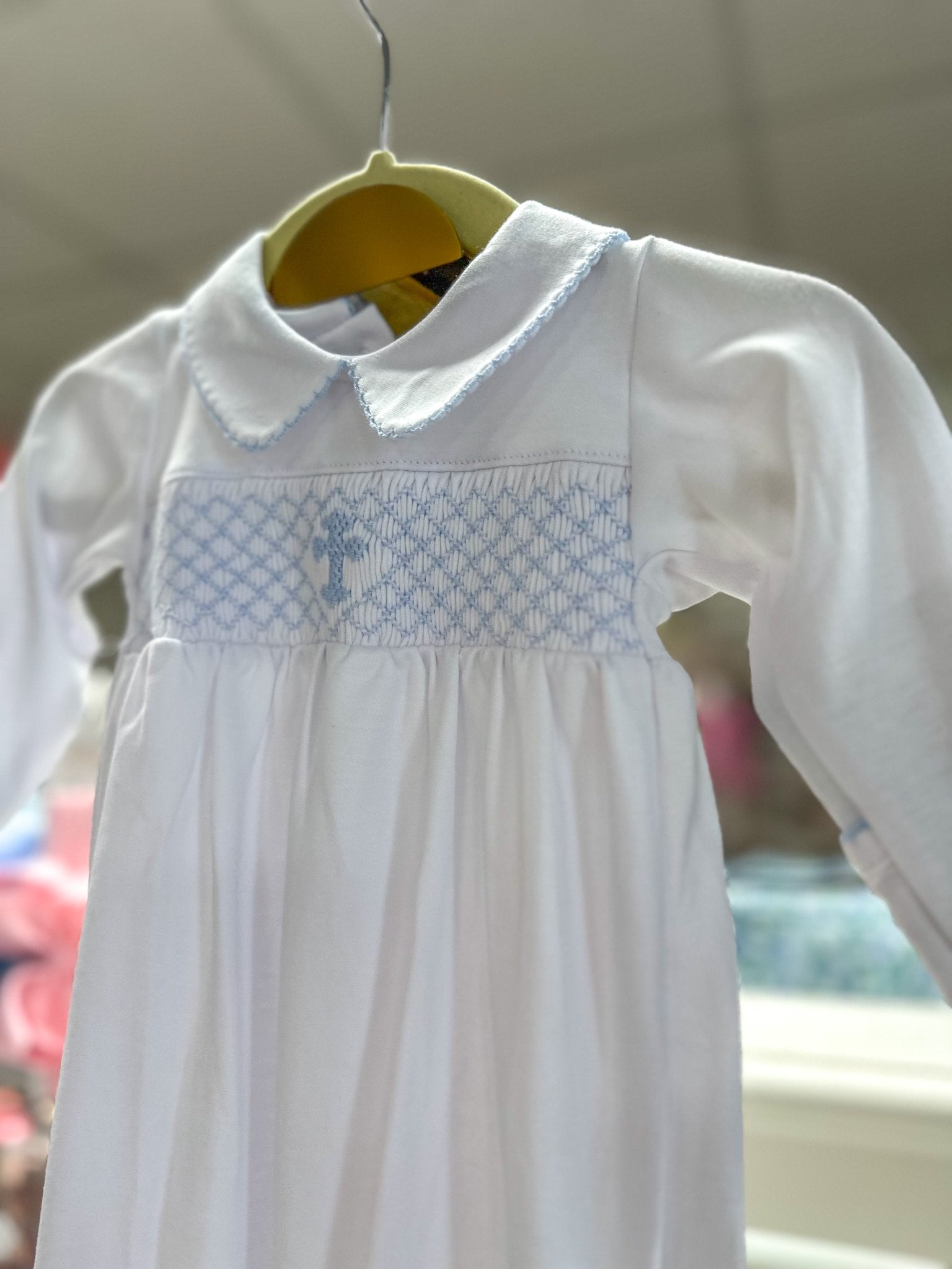 The soft white knit fabric is beautifully detailed with hand-smocked stitching and a light blue embroidered cross at the chest. Finished with a Peter Pan collar and gentle pleating, it’s a sweet and meaningful piece for your little one’s special moments.