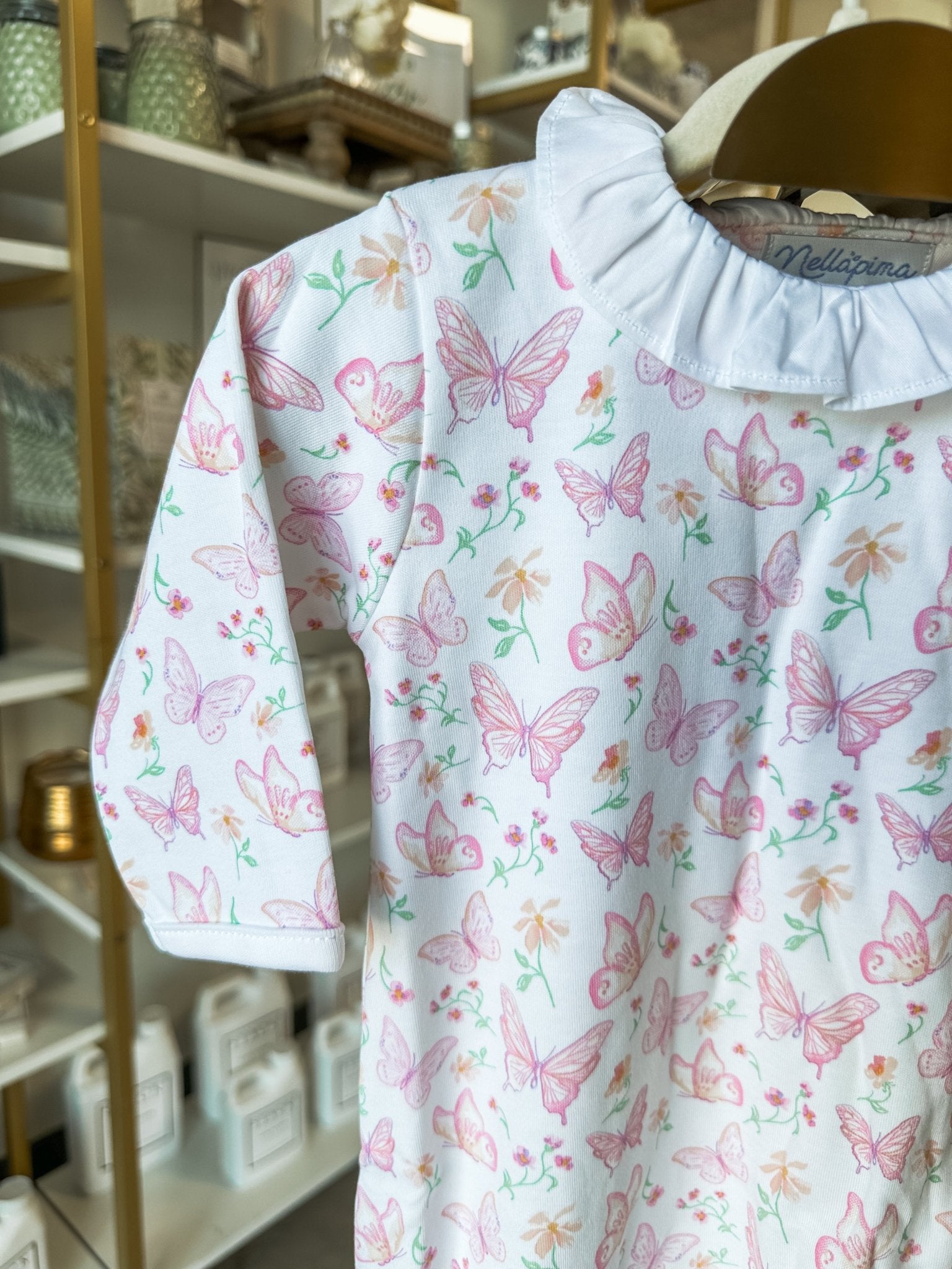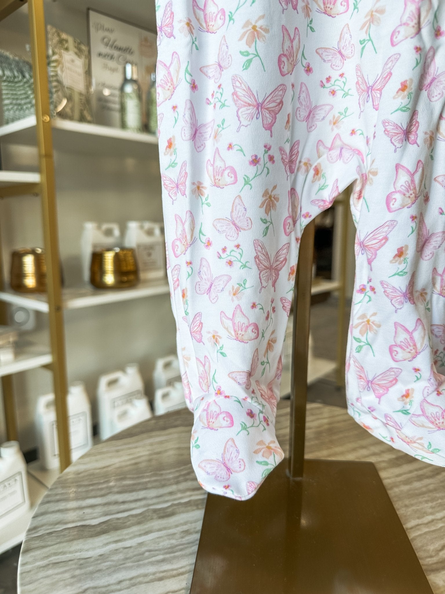 Soft, sweet, and made for easy changes — this butterflies print crossover footie is as practical as it is darling. A must-have for baby’s first wardrobe.