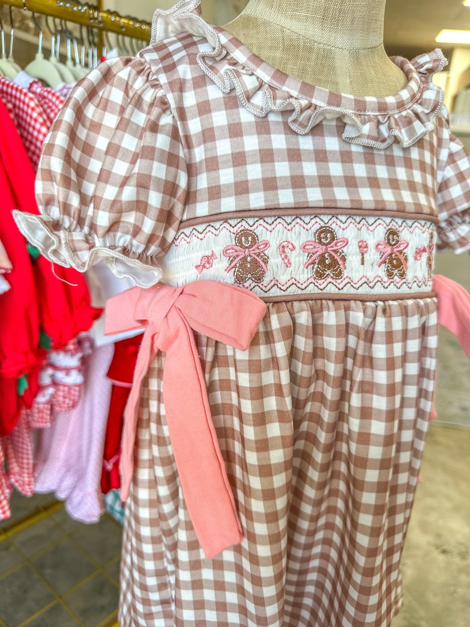 This darling vintage-inspired plaid dress features hand-smocked gingerbread embroidery across the chest and pink bow ties on each side for a classic Christmas look. Perfect for cookie baking, family photos, and festive parties!