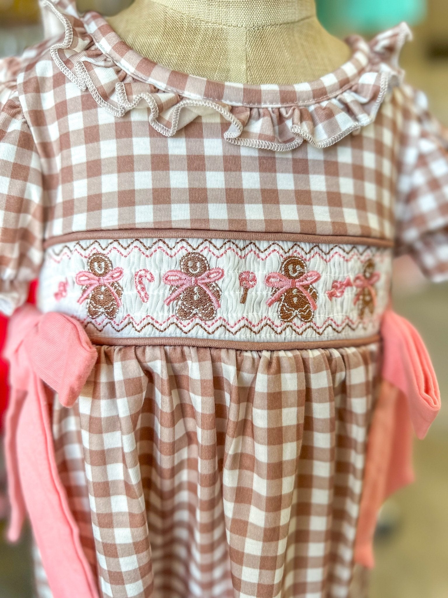 - Brown gingham plaid with smocked gingerbread detail