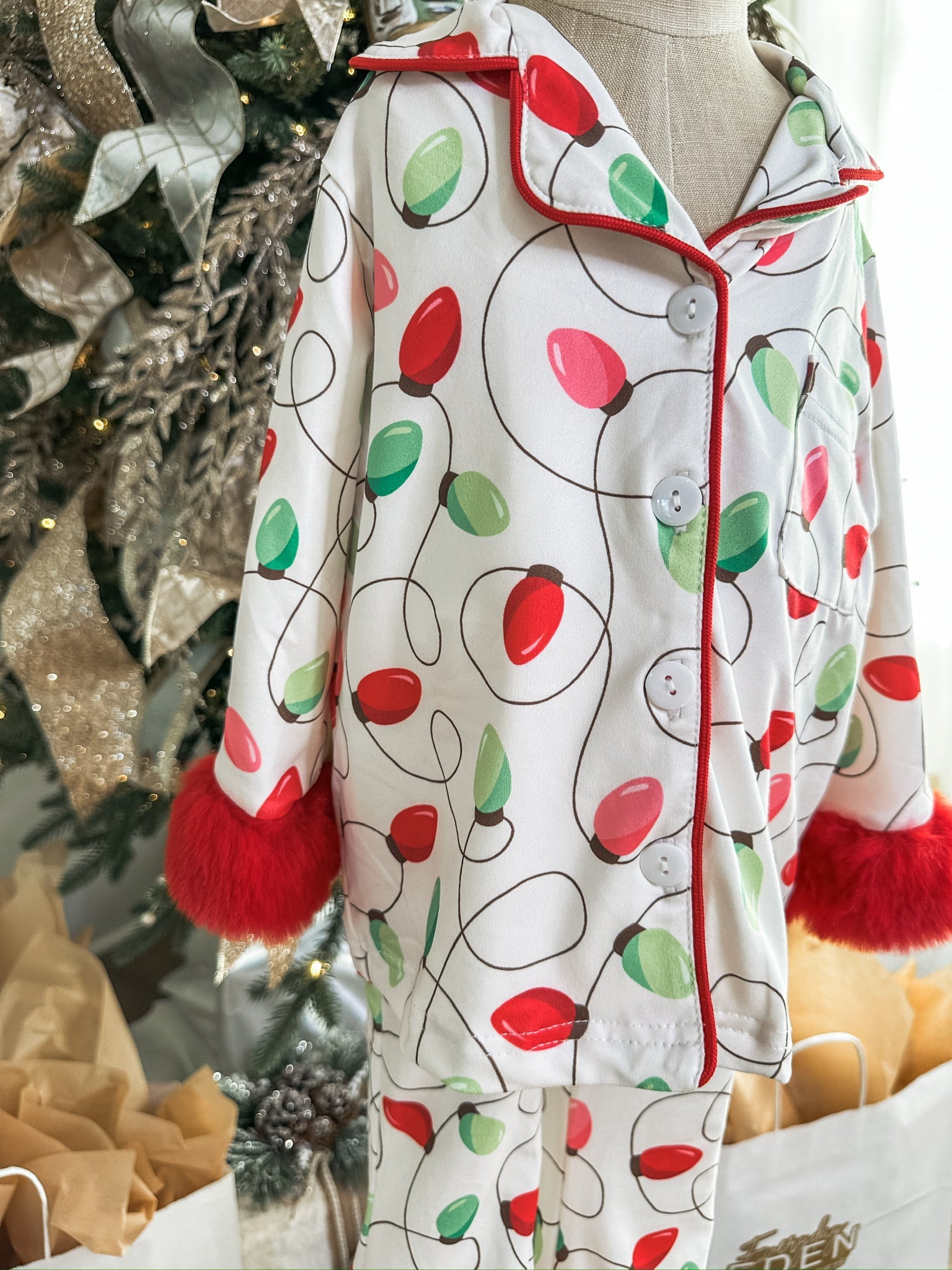 This festive pajama set features a whimsical Christmas lights print trimmed with red piping and fuzzy cuffs for the coziest holiday touch. Perfect for matching sibling sets, movie nights, and those magical Christmas morning photos!