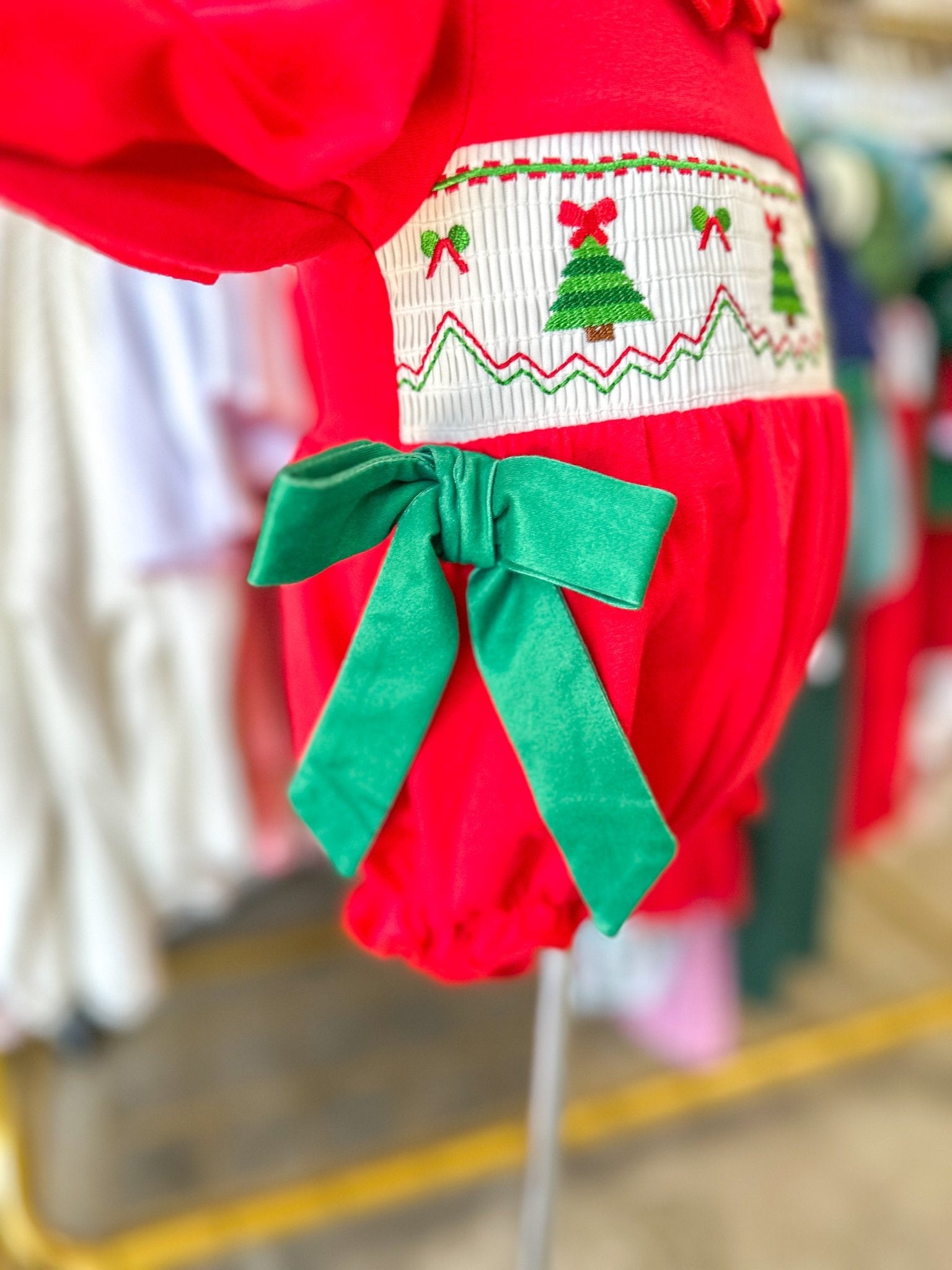 Christmas trees across the chest, a ruffled neckline, and a bold green bow at the waist — it’s the perfect mix of festive and classic. Made for Christmas photos, parties, and holiday memories that last a lifetime.
