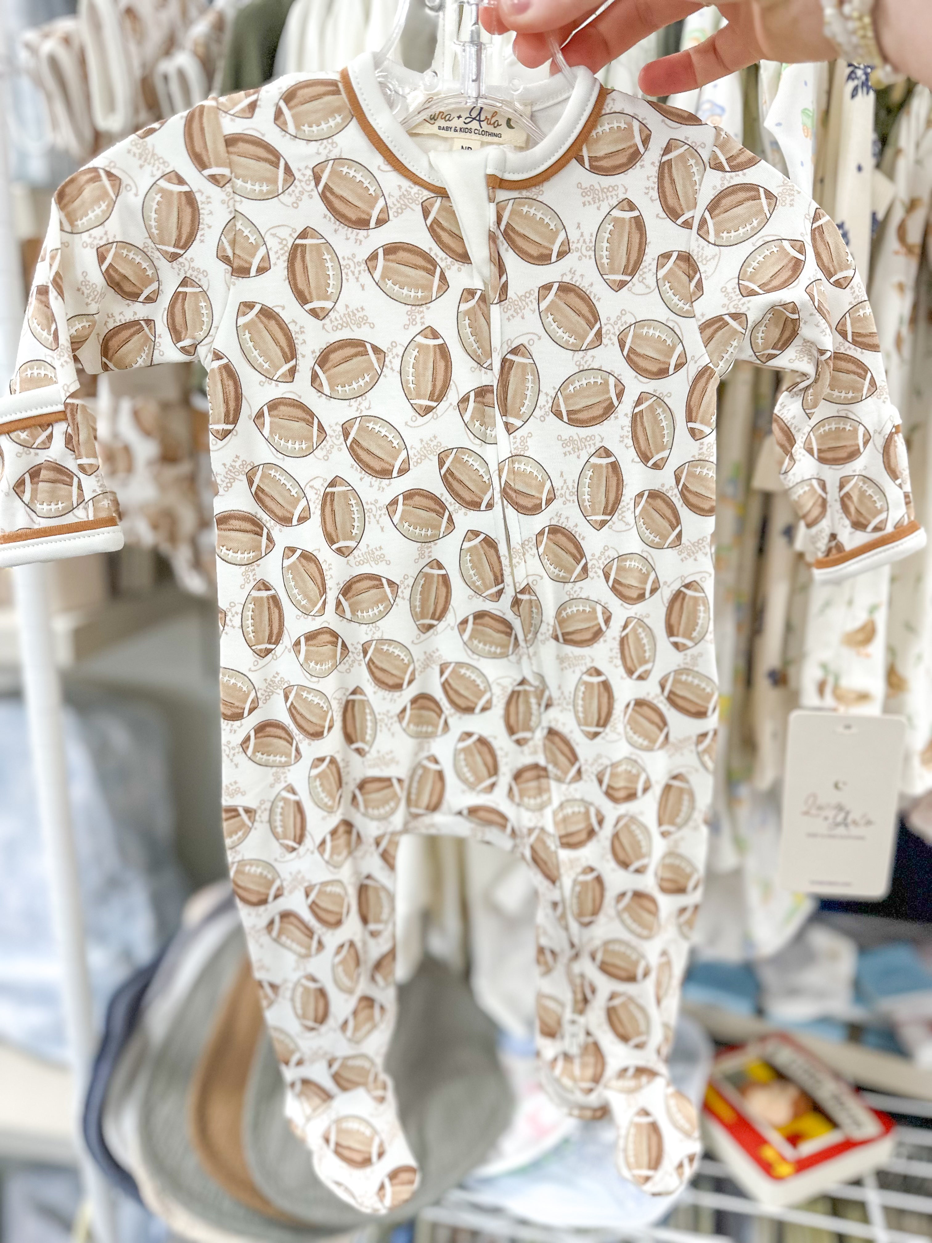 Your tiniest fan will be game-day ready and cozy in our Little Champs Zipper Footie. Designed with both comfort and convenience in mind, this football-print footie is perfect for lounging, naps, and cheering on your favorite team all season long.