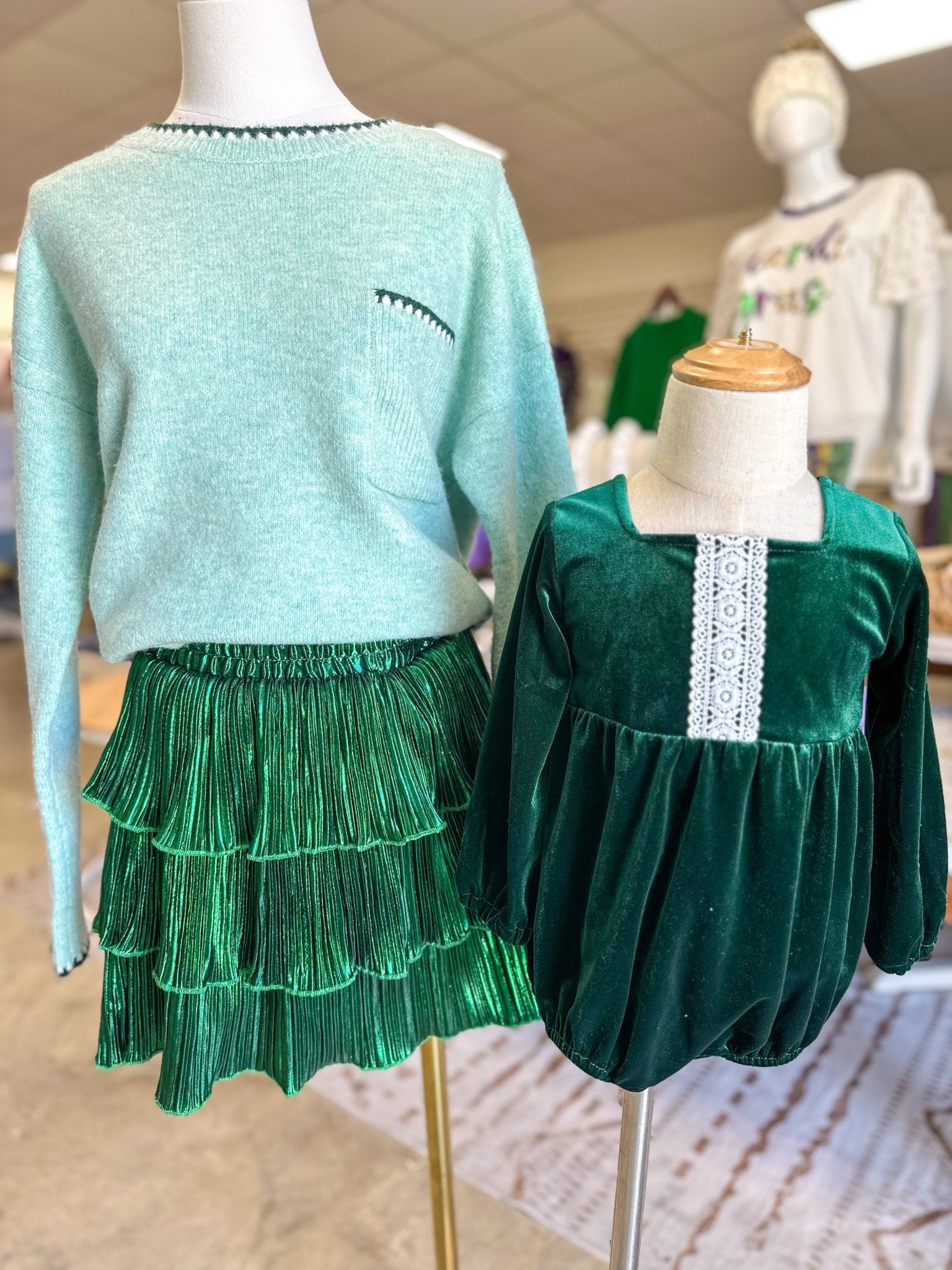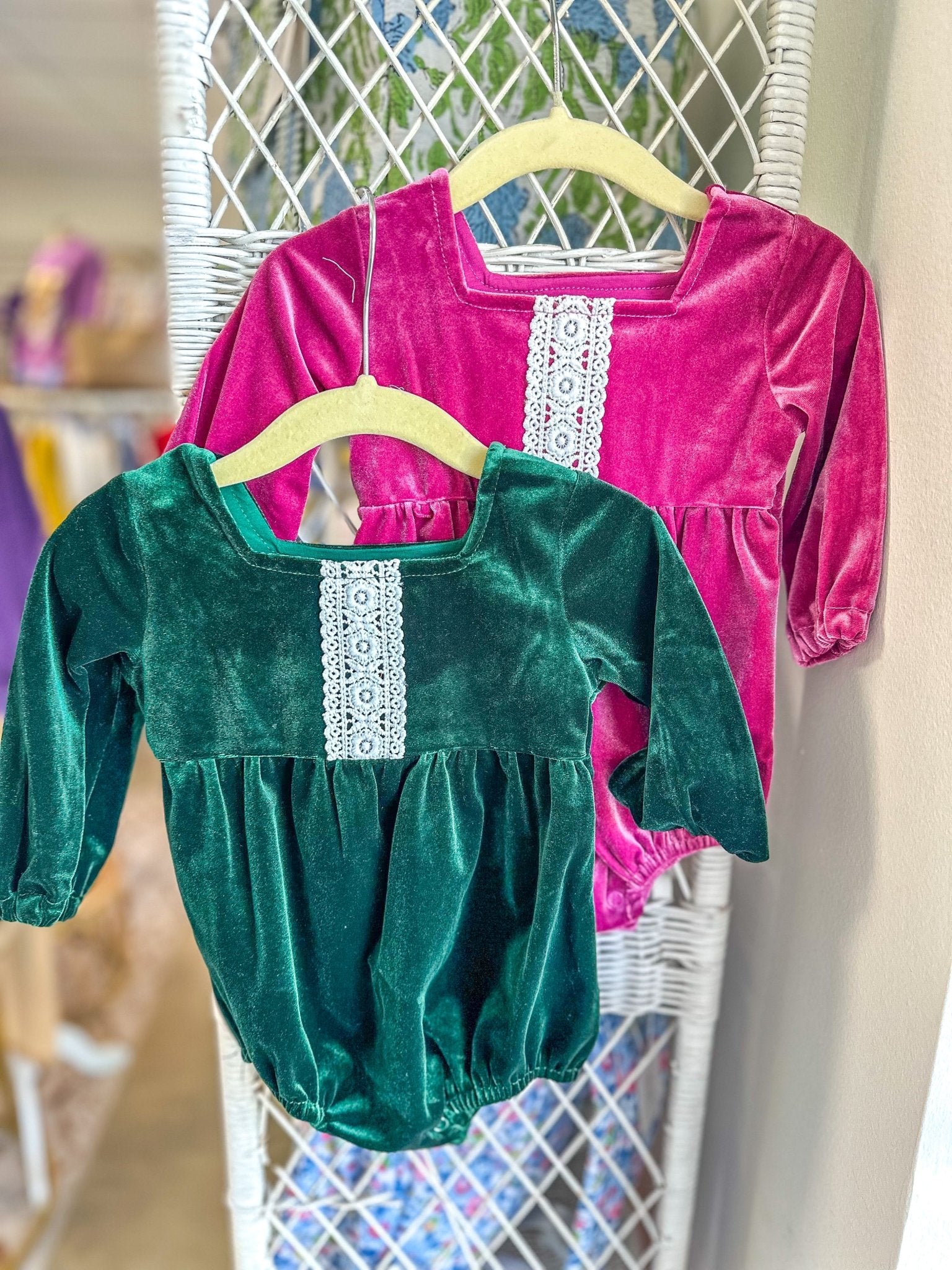 Classic and timeless, this velvet romper is made for holiday photos, family gatherings, and special occasions all season long.