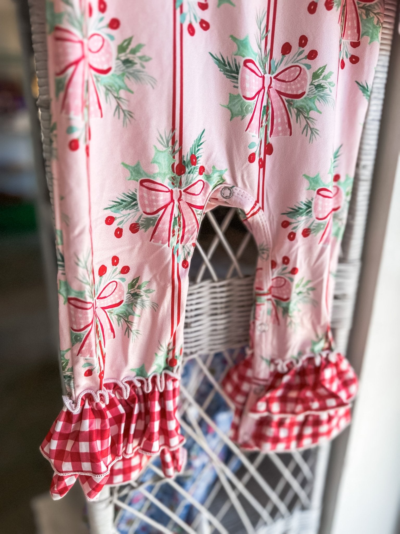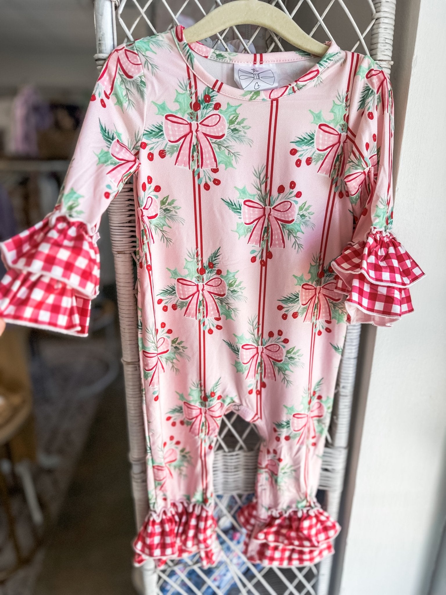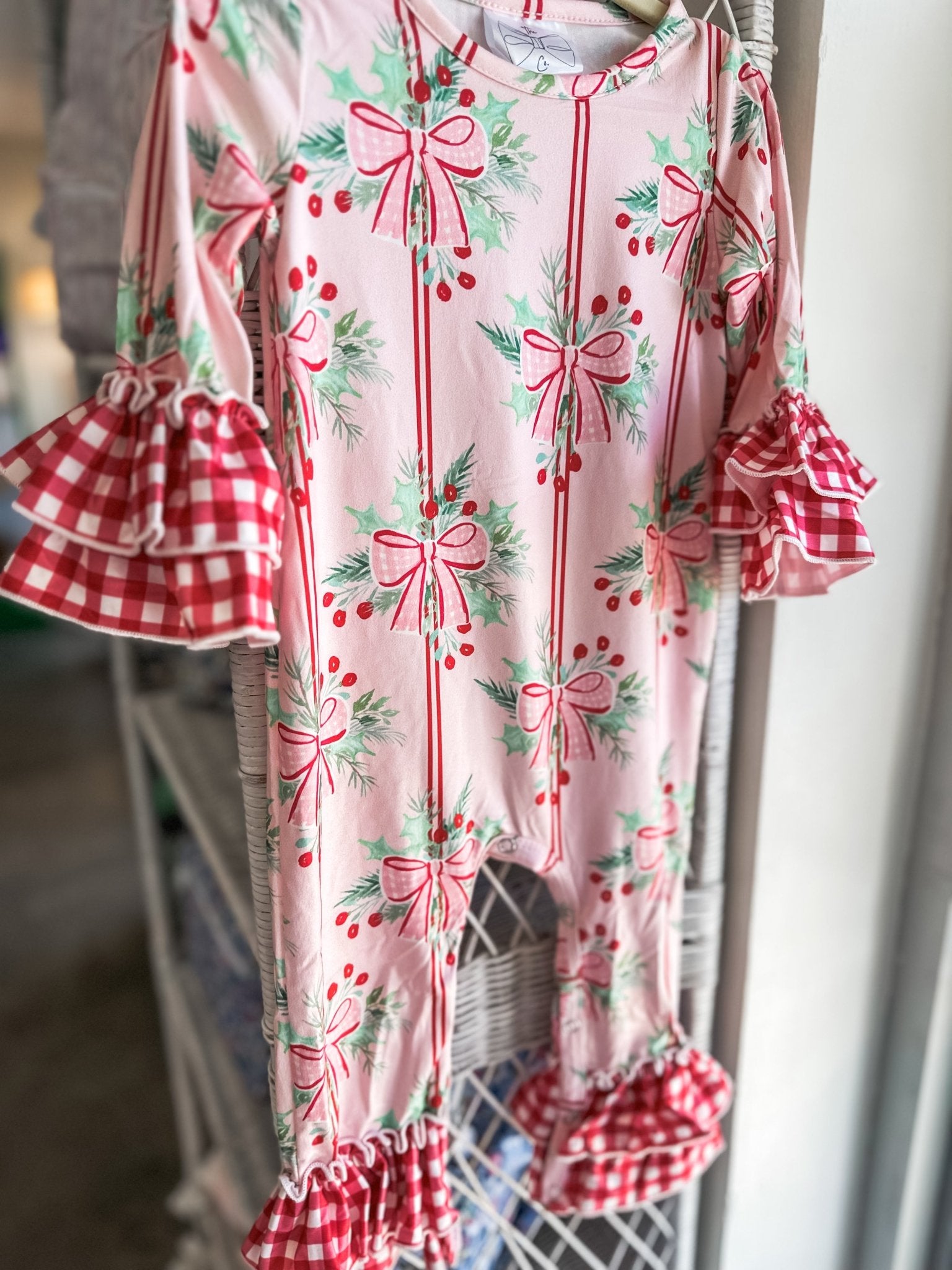 Dress your little one in holiday cheer with this sweet and cozy onesie! Featuring playful red bows, holly accents, and striped detailing, it’s the perfect outfit for Christmas morning, family photos, or holiday parties. The ruffle cuff sleeves add the cutest touch while the soft, stretchy fabric keeps baby comfortable all day long.