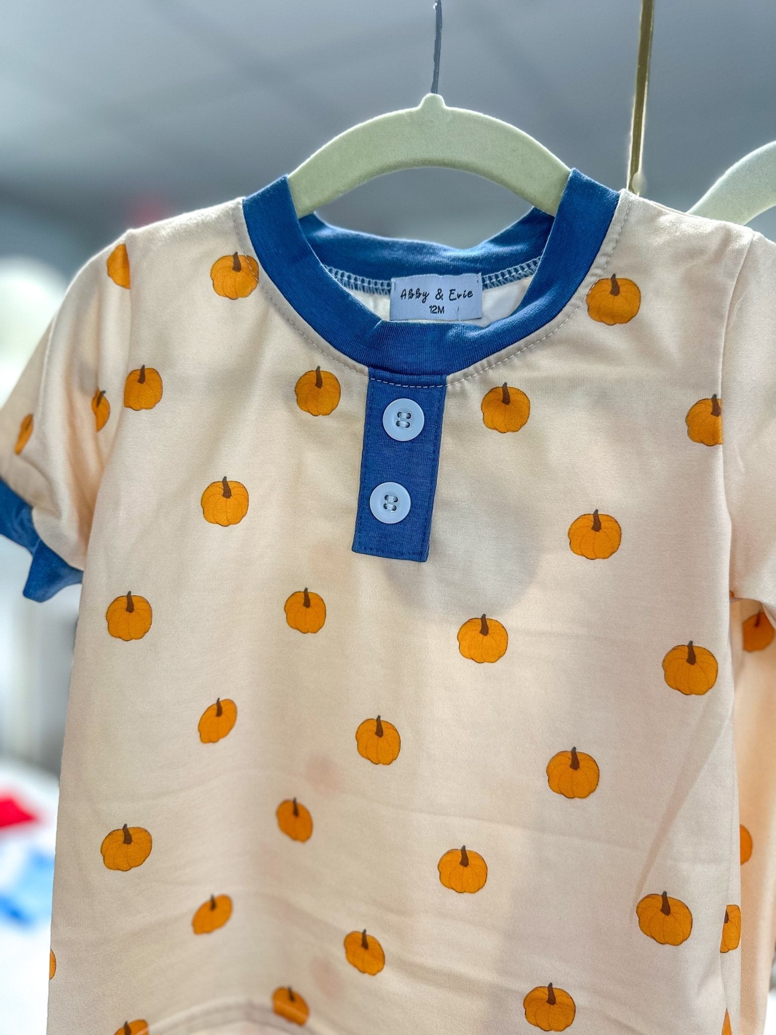 - Soft khaki base with playful orange pumpkin print