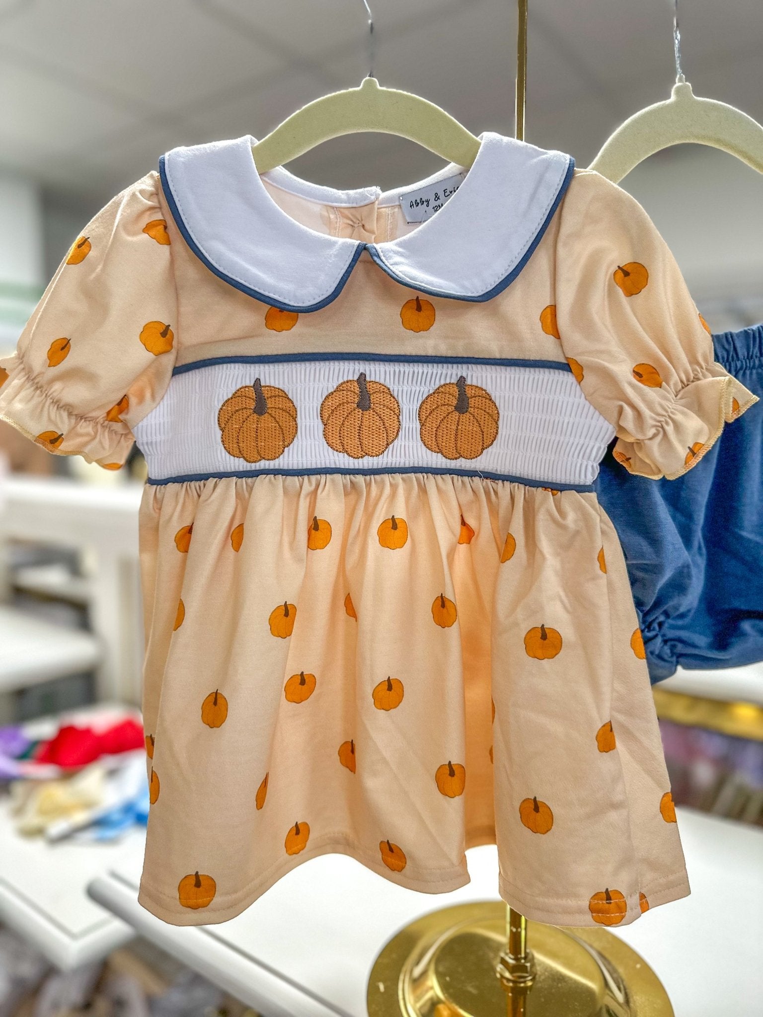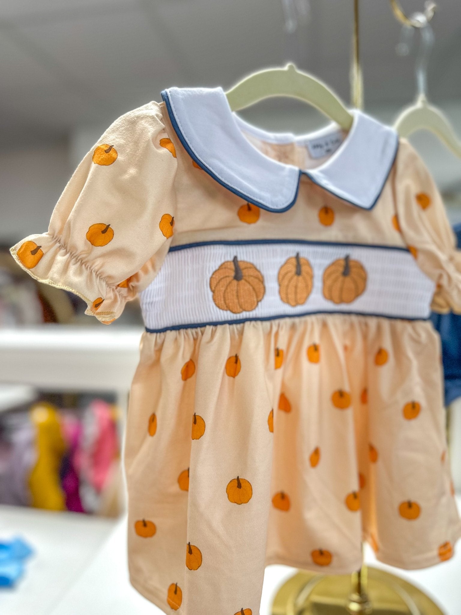- Hand-smocked panel featuring an embroidered trio of pumpkins