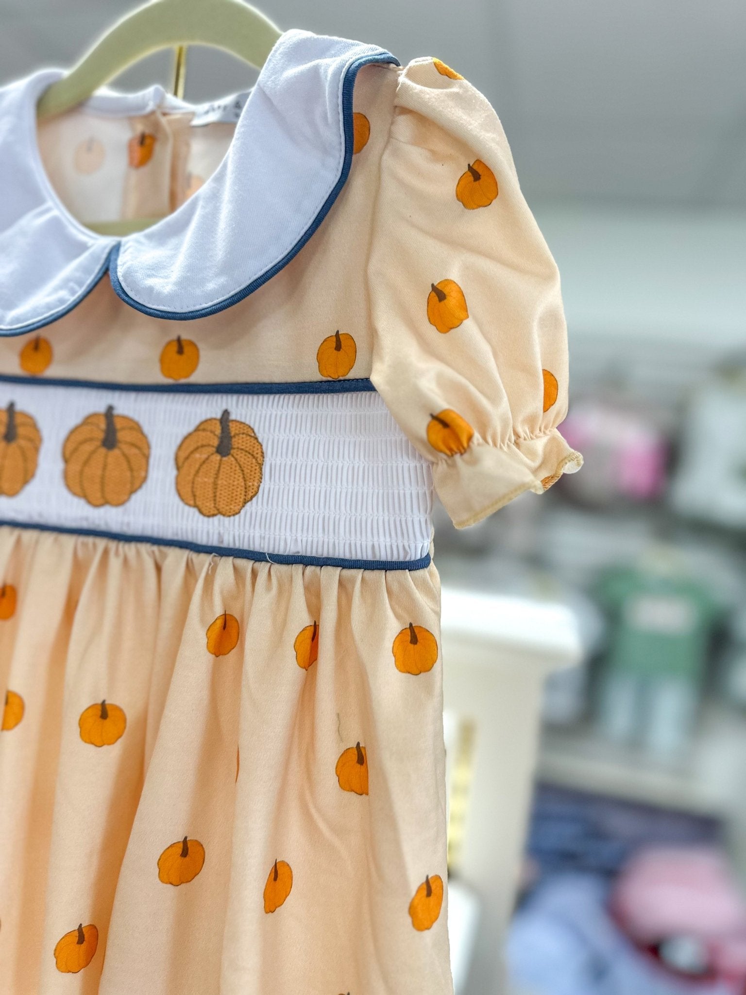 - Hand-smocked panel with an embroidered trio of pumpkins
