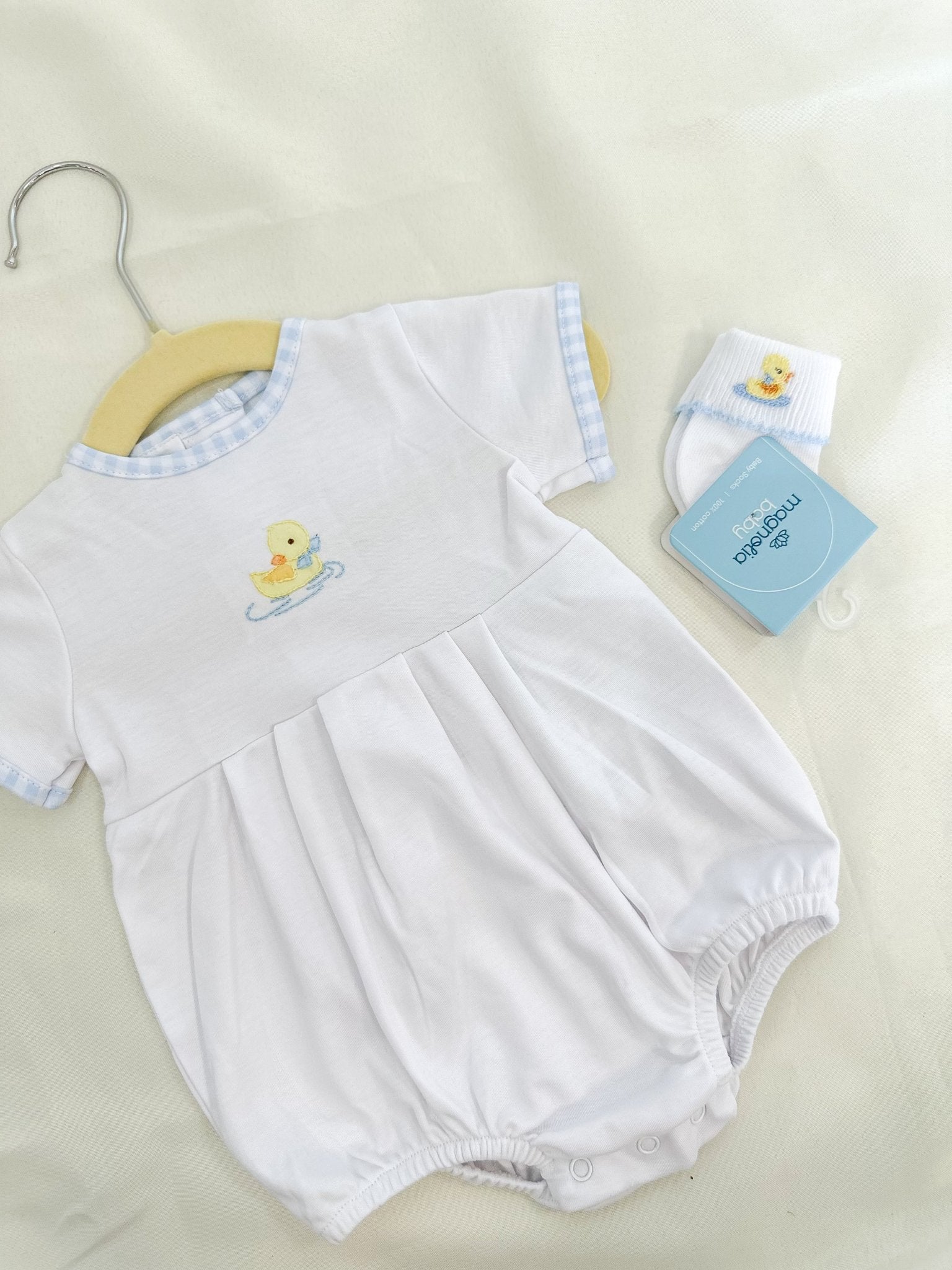 Sweet, simple, and oh-so-precious! This adorable bubble features a soft blue hue with a dainty waddling duck embroidery for a classic baby boy look. Made from breathable, lightweight fabric, it's designed to keep your little one comfy and cute for any occasion.