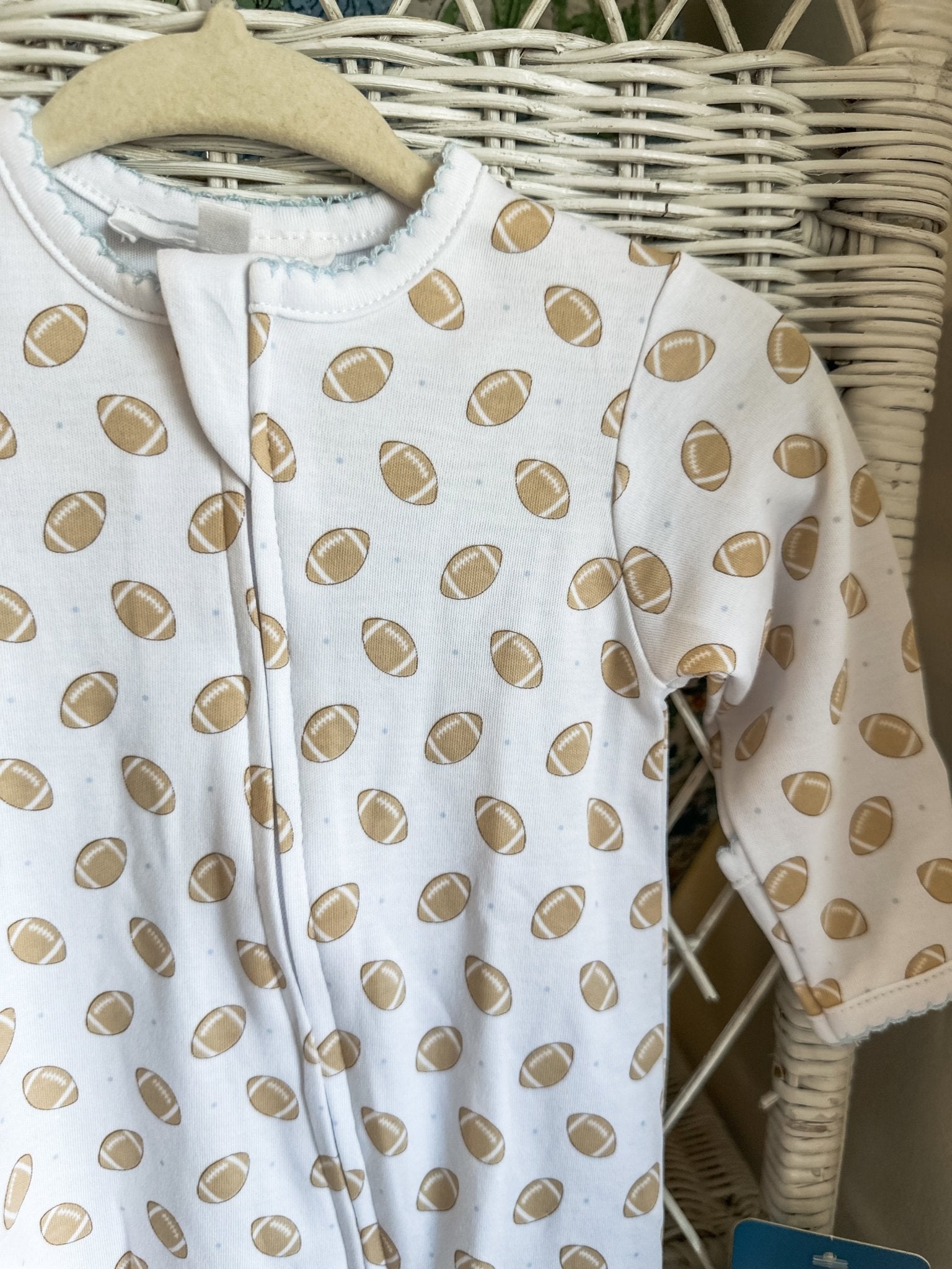 Game day just got even cuter with this football-print zippered footie in soft light blue. Perfect for cozy snuggles, nap time, or cheering on your favorite team, this one-piece blends comfort and spirit.