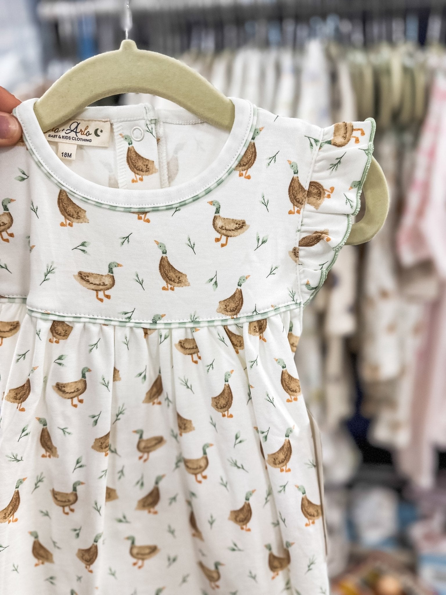 A sweet and playful dress made for everyday adventures and picture-perfect moments alike. With its charming mallard print and fluttery details, this darling piece is as comfortable as it is adorable for your little one.