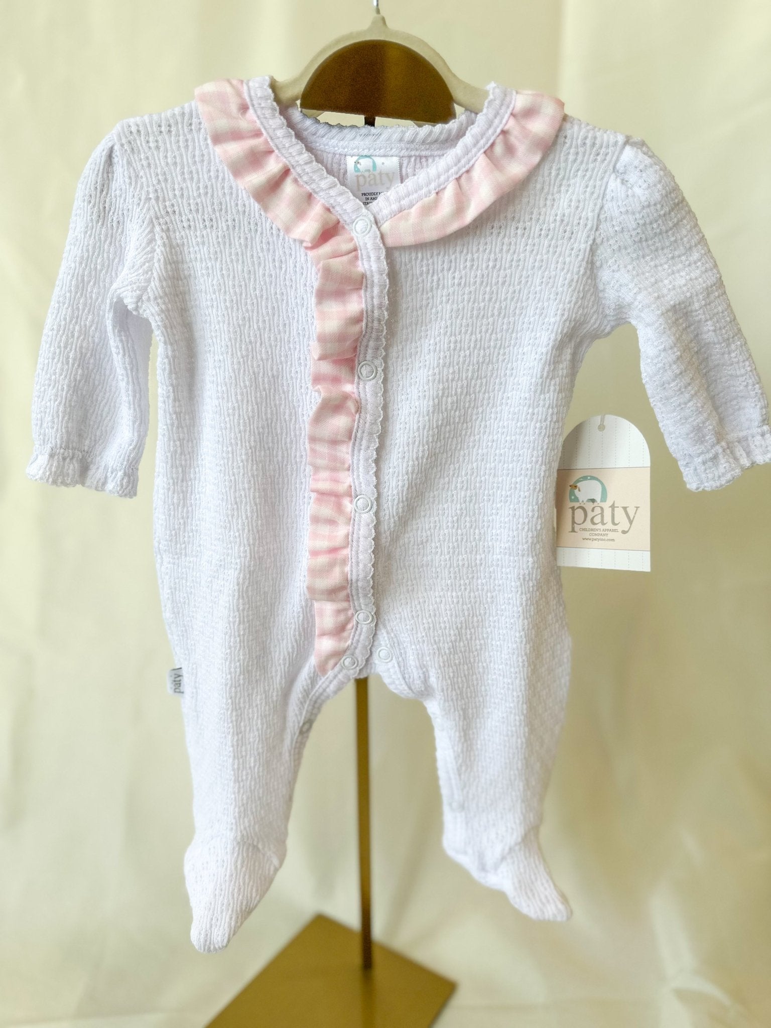Sweet dreams start here 💗 Whether you’re bringing baby home or dressing her up for cuddly mornings, this footie is a keepsake piece you’ll reach for again and again. Crafted in Paty’s signature soft knit, it features a classic snap-front design with delicate pink gingham trim and the cutest ruffle collar. Built-in footies keep little toes warm, and the stretchy fabric ensures all-day comfort.