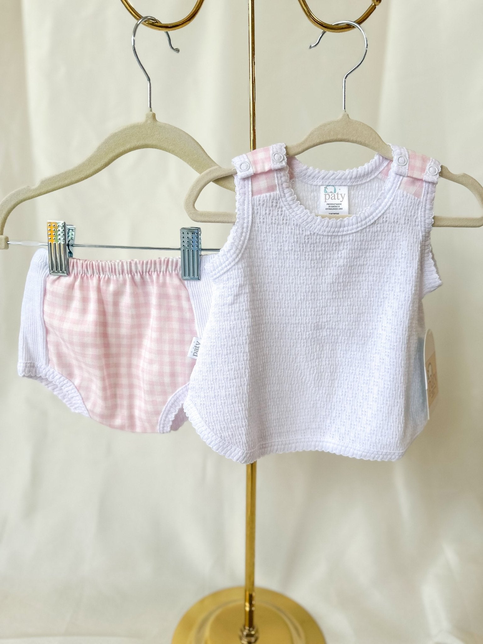 The sweetest summer essential for your little one! Perfect for warm days at the park, family brunch, or just looking darling at home. This two-piece set includes a lightweight, sleeveless top with pink gingham button tabs on the shoulders and a coordinating diaper cover in soft pastel pink checks. The textured knit fabric is breathable and gentle against baby’s skin, keeping them cool and comfy all season long.