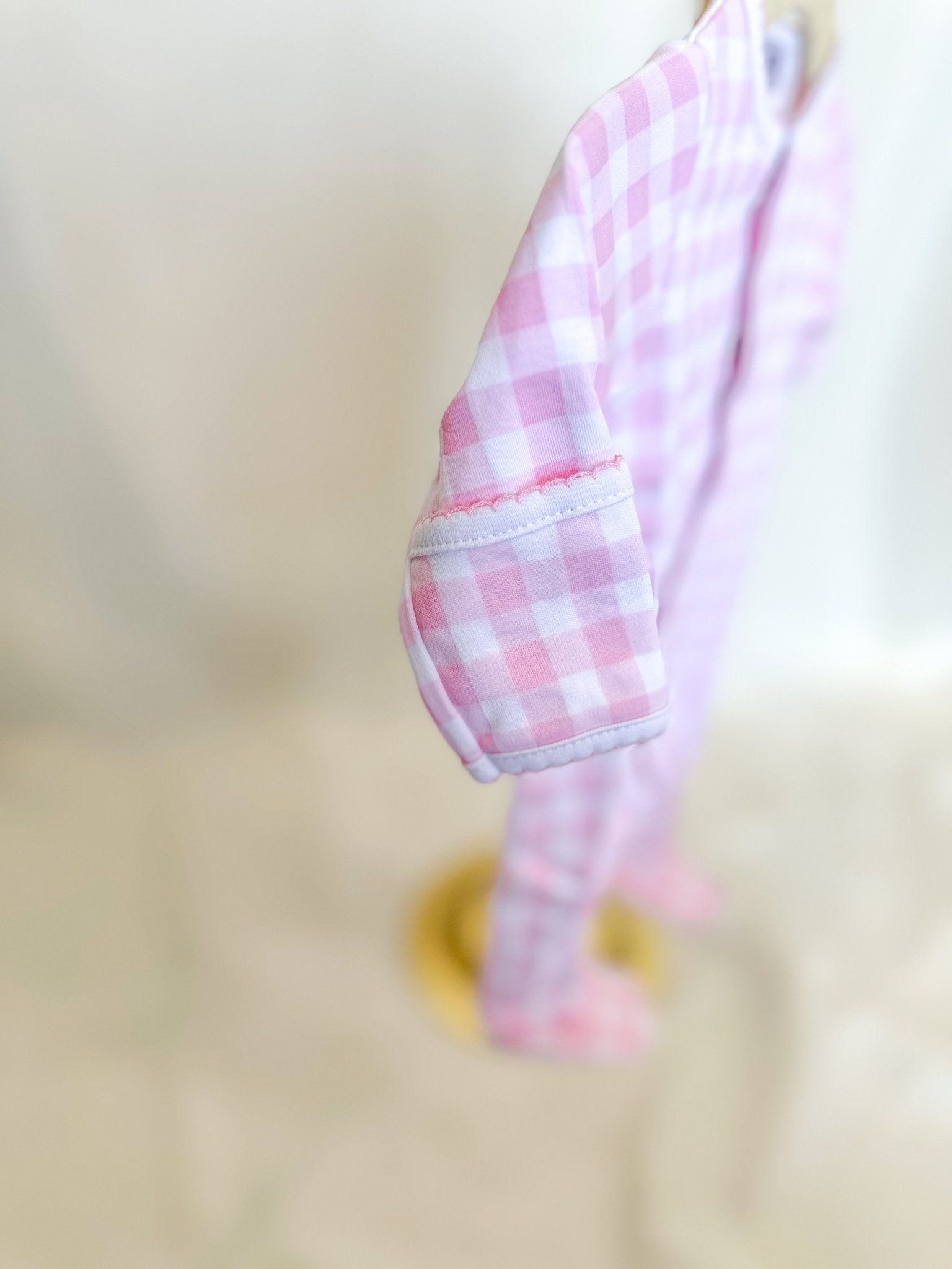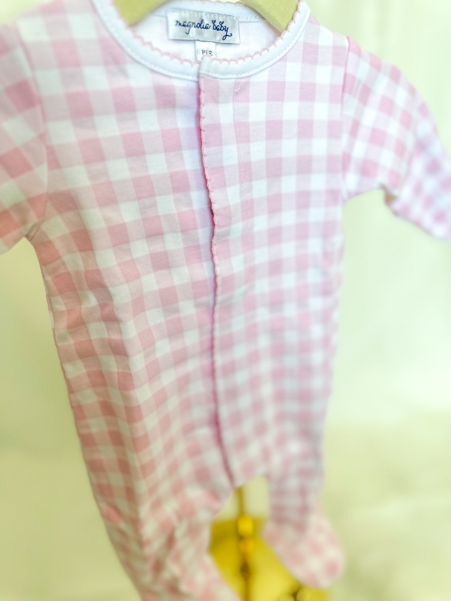Soft, sweet, and ready for snuggles — this adorable pink gingham footie is a must-have for bringing baby home or everyday cuddles. Crafted in ultra-soft cotton with the perfect touch of stretch, it’s gentle on delicate skin and comfy enough for naps, playtime, and everything in between. The classic check pattern gives it a timeless Southern feel, and the secure snap-front design makes diaper changes a breeze.