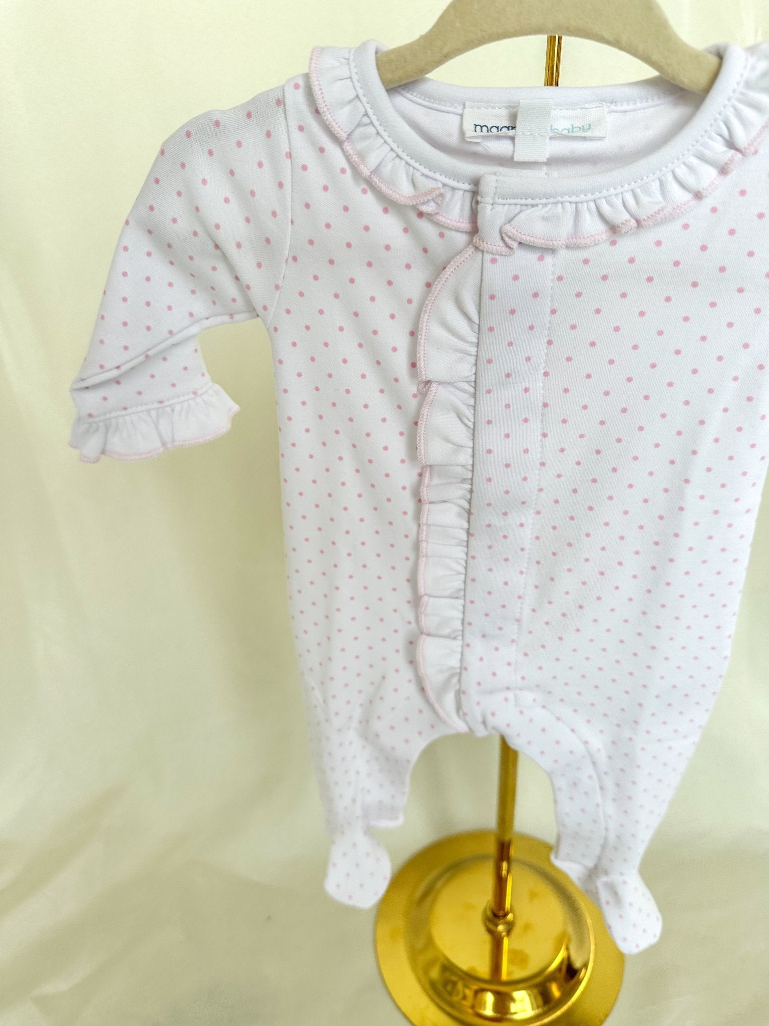 Pretty in pink and perfectly cozy! This sweet footie features a soft pink mini dot print and a ruffled front for the cutest feminine touch. Designed with comfort in mind, it's made from breathable fabric to keep baby snug day or night. Perfect for naptime, bedtime, hospital visits, or baby's first photos